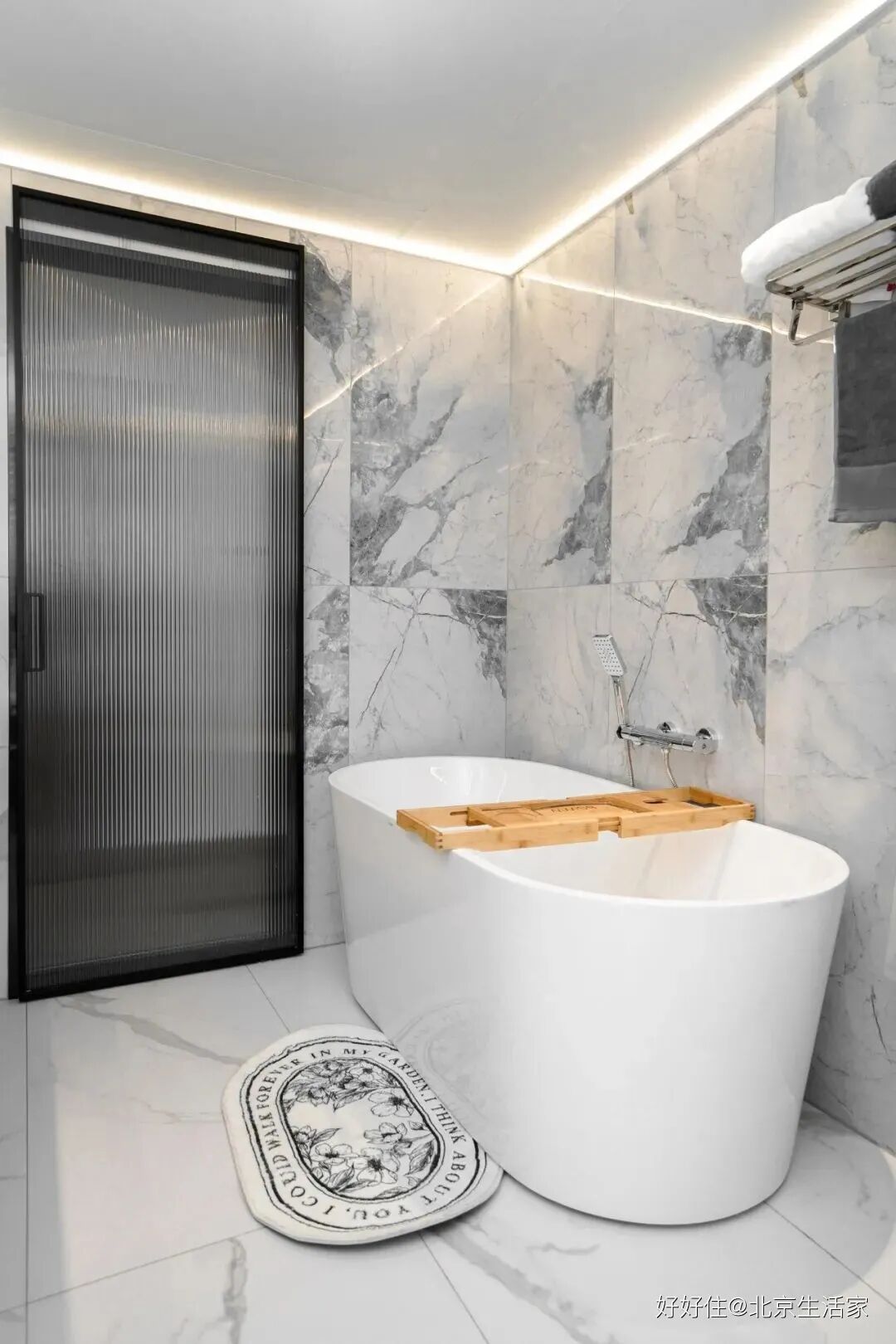 北京生活家:业主想要的浴缸也安排上,工作一天的疲劳感在此处得到释放,点上香薰,一首轻盈的音乐,让身心彻底放松下来。