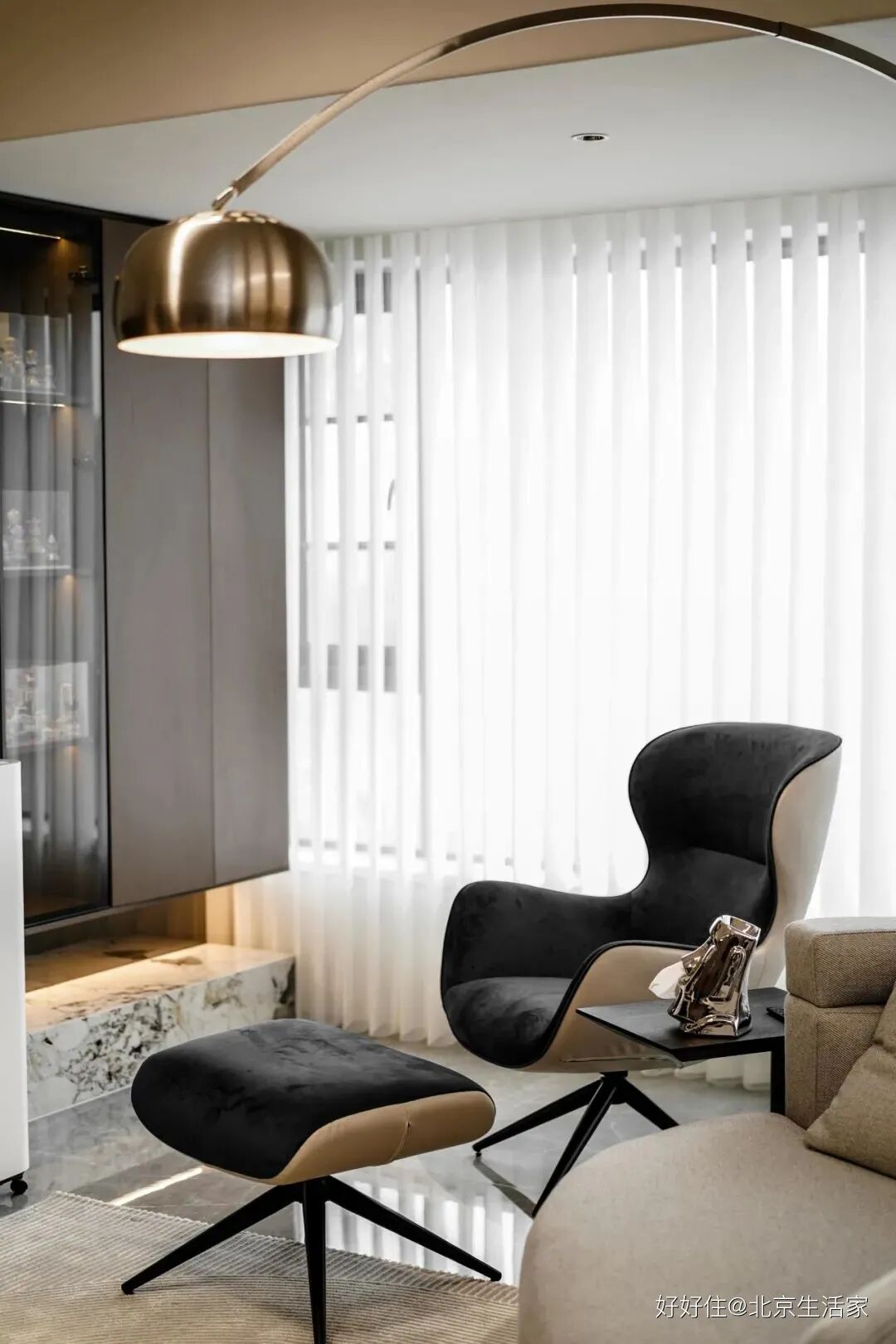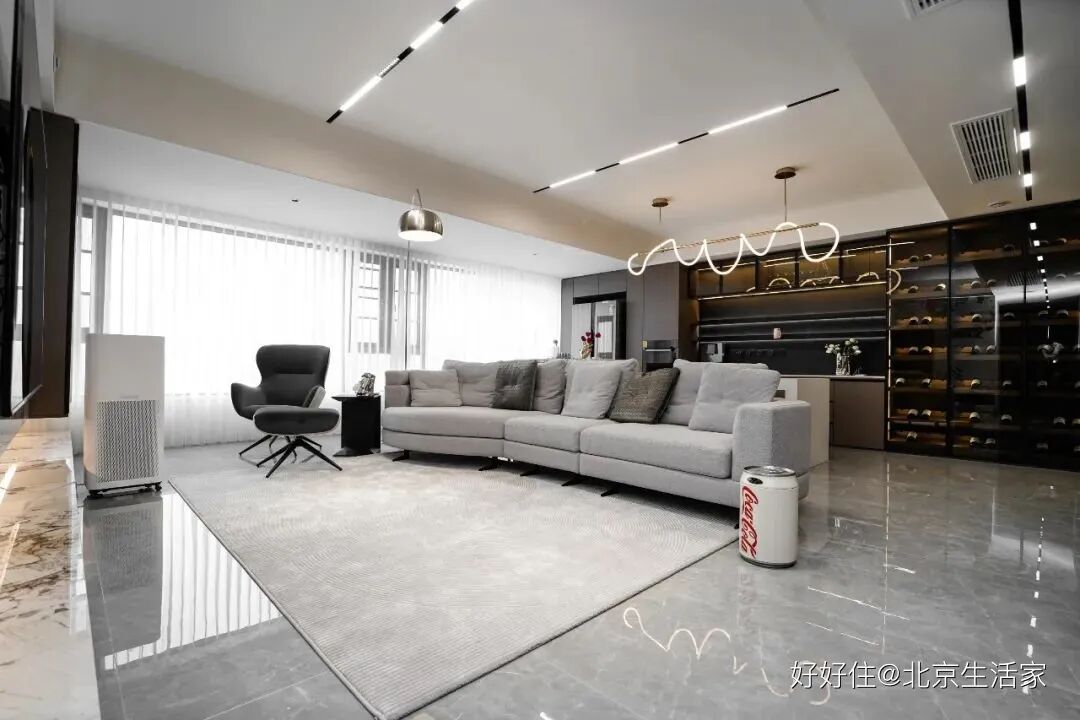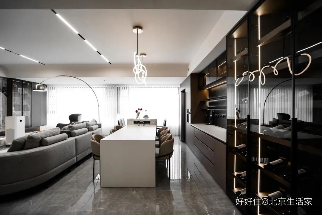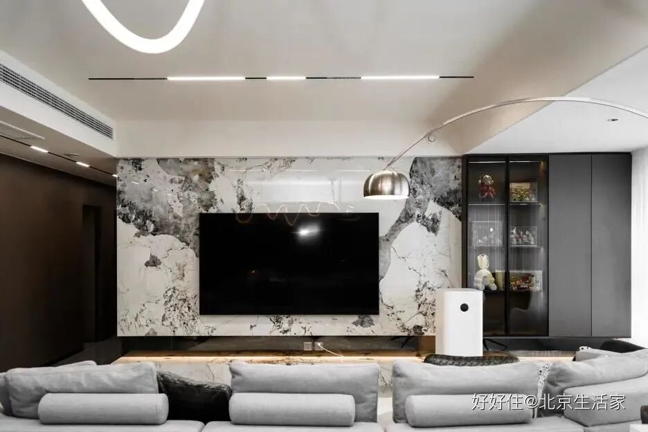 北京生活家:设计师把吊顶做成了无主灯设计,利用线灯来作为主要照明,还有落地灯用简单的曲线勾勒出优雅弧度。大理石材、玻璃元素、深色木材混合,不同的墙面材质丰富了视觉感官和空间温度。