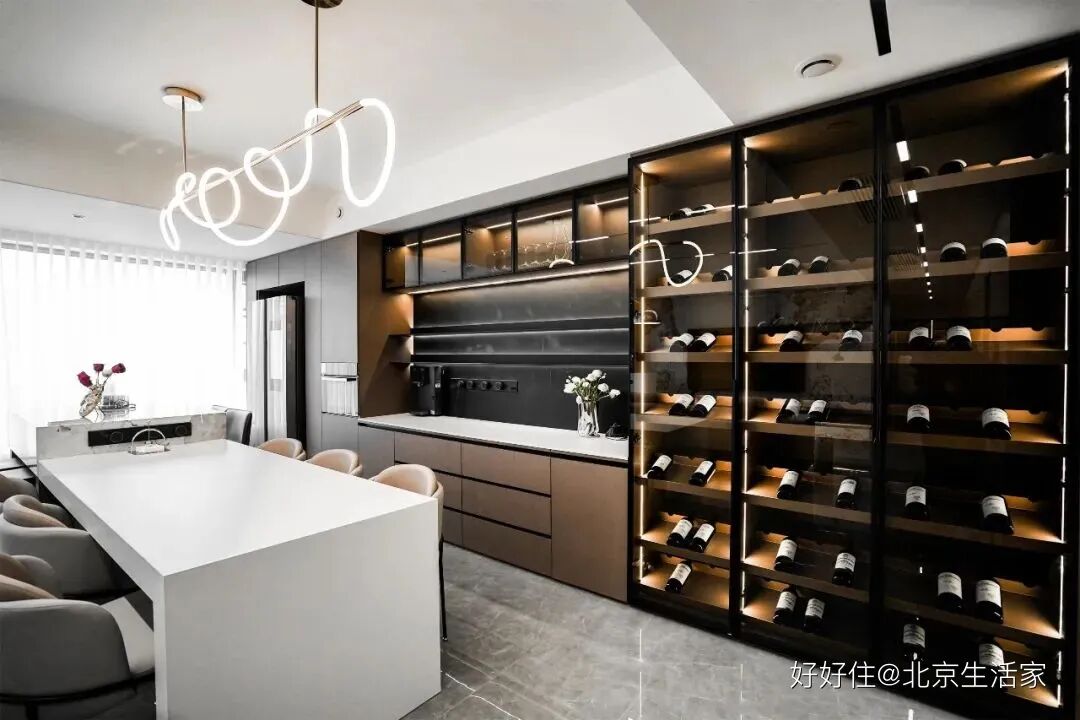 北京生活家:设计师做了一个西式厨房,因为不会有油烟的困扰,所以开放式设计。整体迎合了客厅的风格设计,旁边一整面的深木色储物柜和茶色的玻璃酒柜组合,颜值既高实用性也是照顾的很周到。