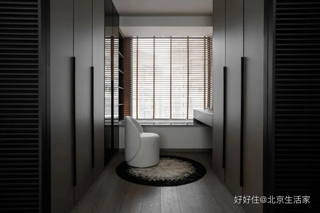 北京生活家:黑色推拉门隔出了一间衣帽间,定制衣柜和精巧的梳妆台连贯合一,靠窗的位置更便于日常化妆,让空间回归到功能性。
