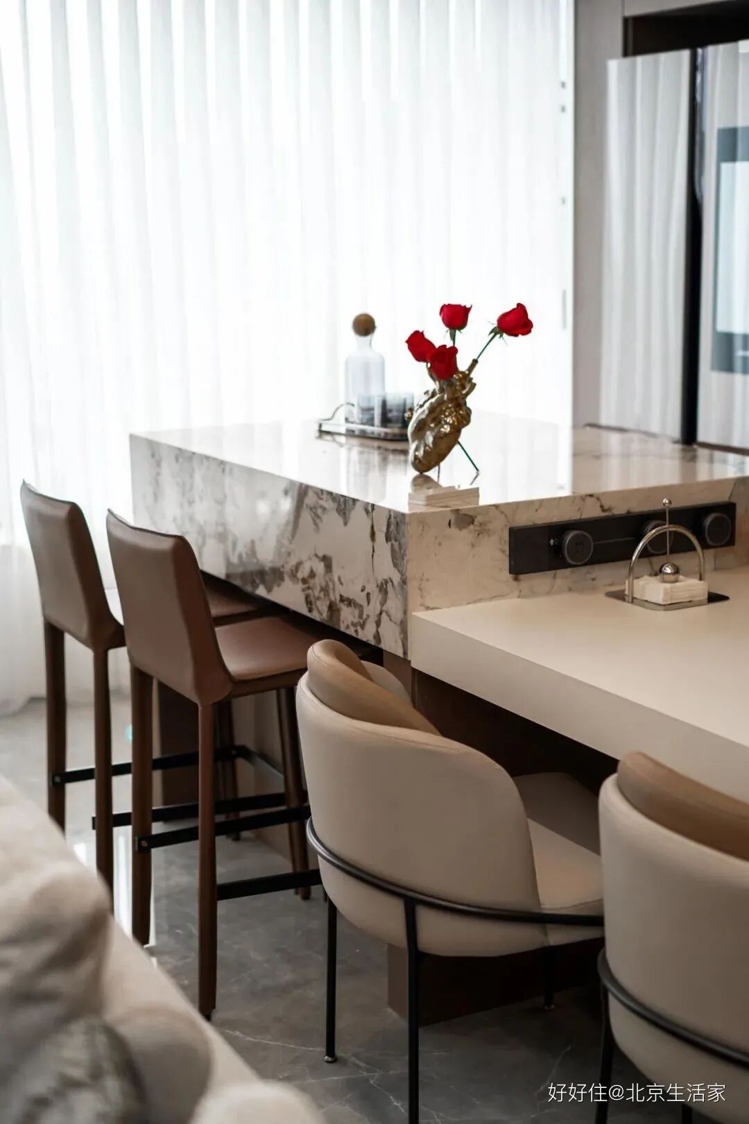 北京生活家:吧台自带高级感,还有大理石的清冷感,混合在一起把优雅表现得淋漓尽致,桌上一束娇艳欲滴的玫瑰装点生活的仪式感,给家增添了更多温柔。