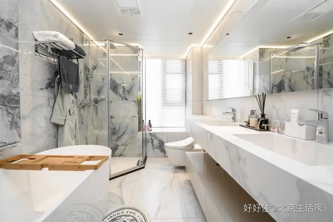 北京生活家:卫浴直接影响了生活的舒适感,白色色系明亮雅致,灯带和筒灯的设计,不仅增添了灯光层次感,也让浴室更具氛围感。