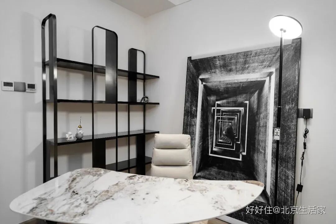 北京生活家:身为律师,赵小姐平时办公的时间也比较多,这间书房就是让赵小姐静下心来办公的地方,简约干净的搭配呼应全屋基调,小巧的书架也不会占据太多空间,一幅黑色装饰画增添了别样的艺术感。