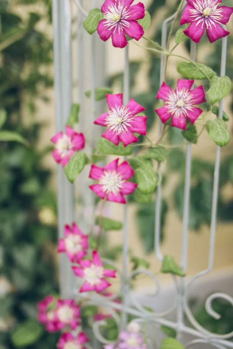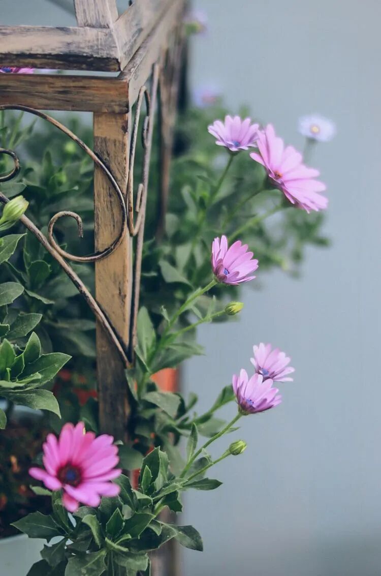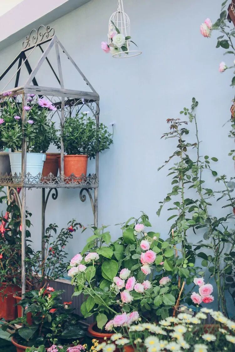 添加铁艺屏风后,整个空间变得更加分层,花儿爬上了小铁架,更加美观。幸福树和南天竹林高低错落,相映成趣。