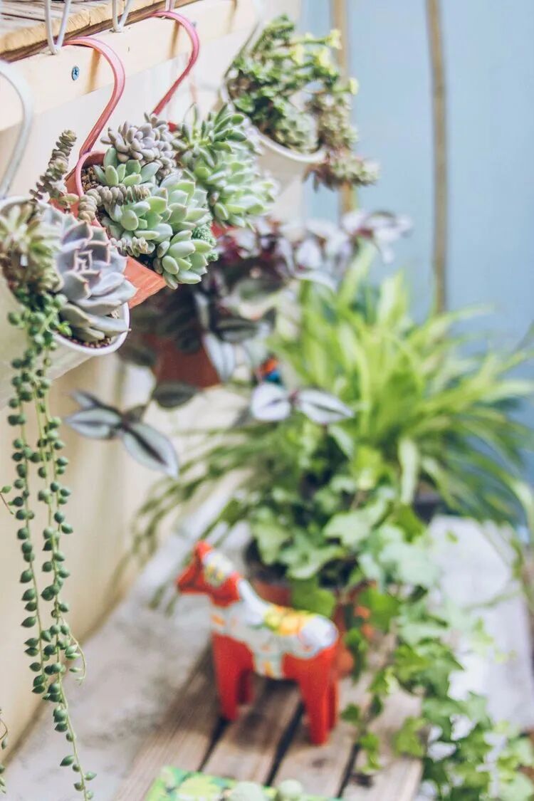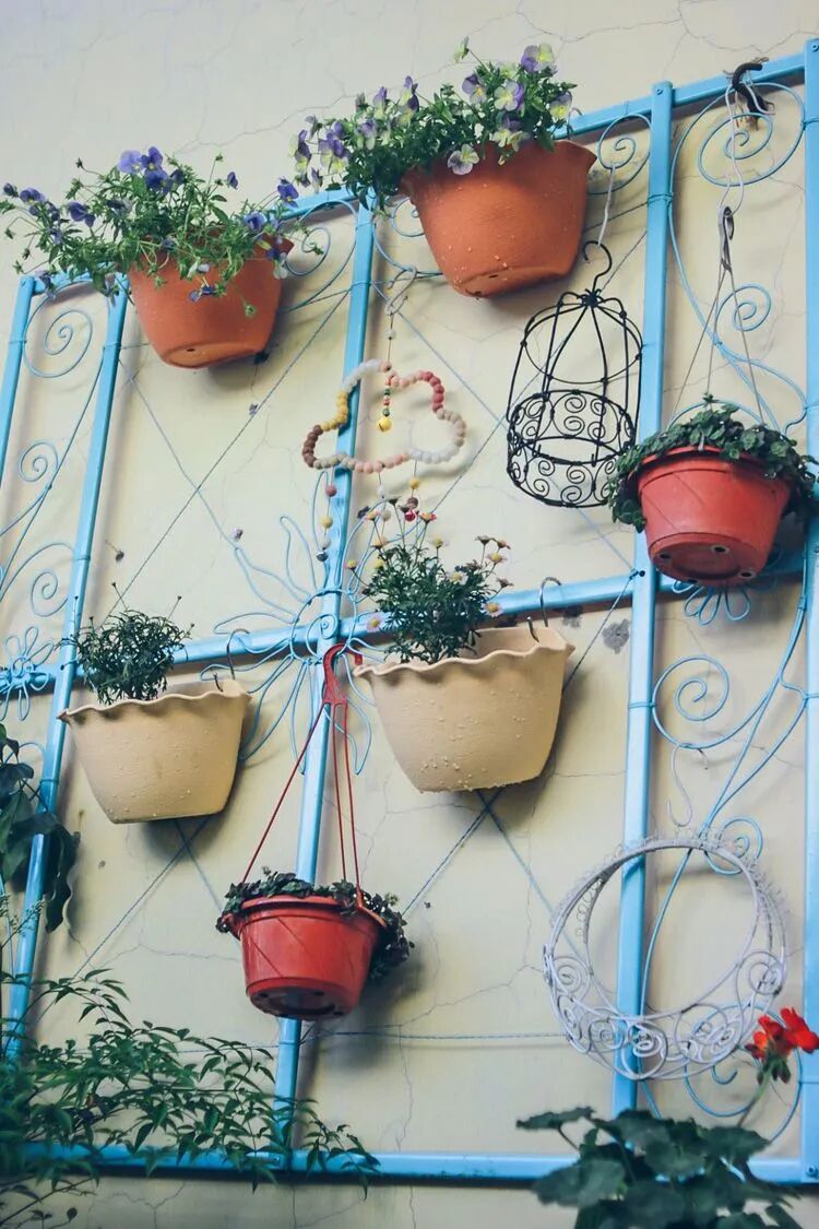 西边是房间的外墙,早晨有阳光。爸爸做了一个蓝色的铁艺花架,可以装饰和悬挂小花盆栽。