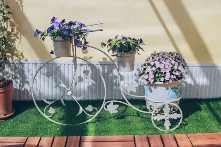 在这堵墙的尽头是一个铁艺自行车花架。花儿像精灵,不断盛开。