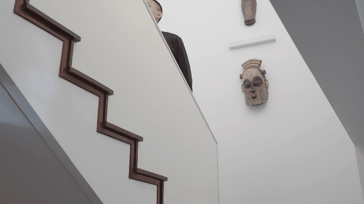 楼梯上挂着两张100多年前的非洲部落面具:上方是先人面具,这个部落的成人礼是野外生存挑战,若成功通过,就会被赐予;下方是法师面具,村里有威望的巫师才能佩戴。