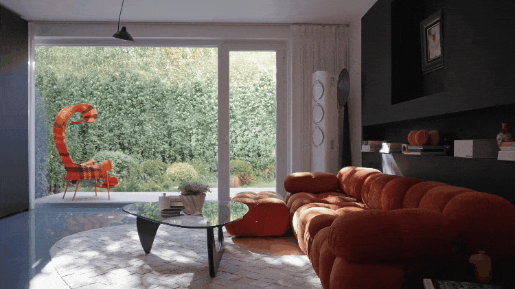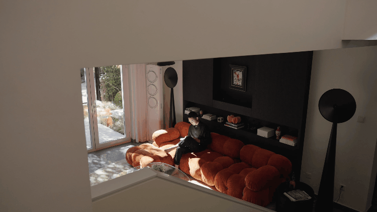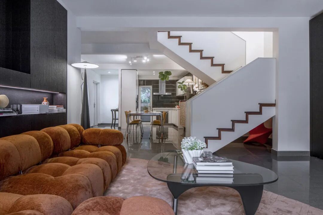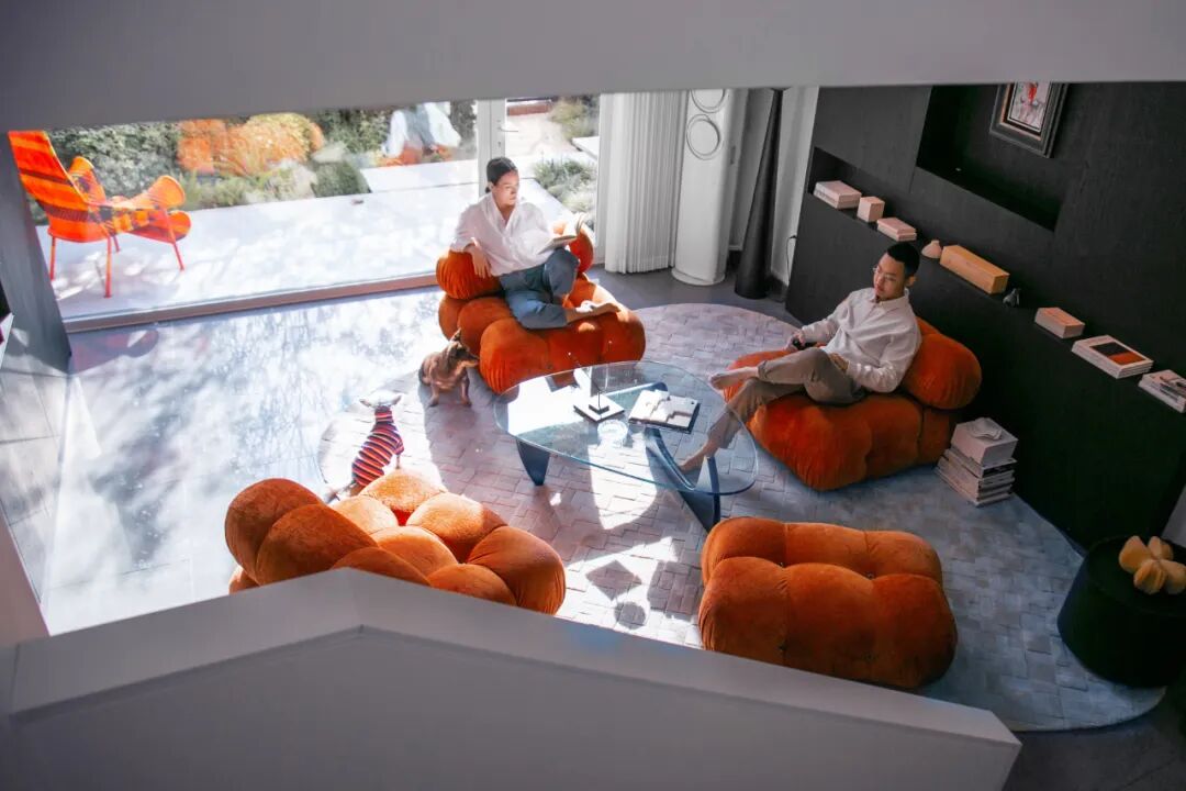 客厅也简洁,用可拆解、组合的橘色沙发“提亮”。
