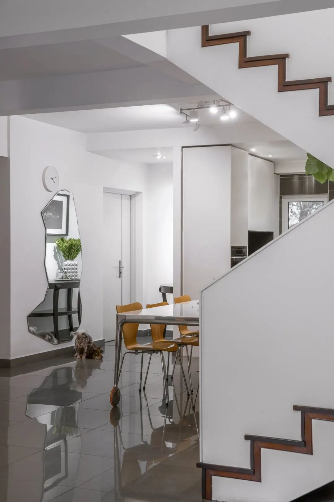 玄关的那块异形镜子由王左千仿照假山的形态设计,他说:“北京的园林、公园里多假山,有些奇特的造型真是可遇不可求,我就自由发挥,在家造一座小假山。”