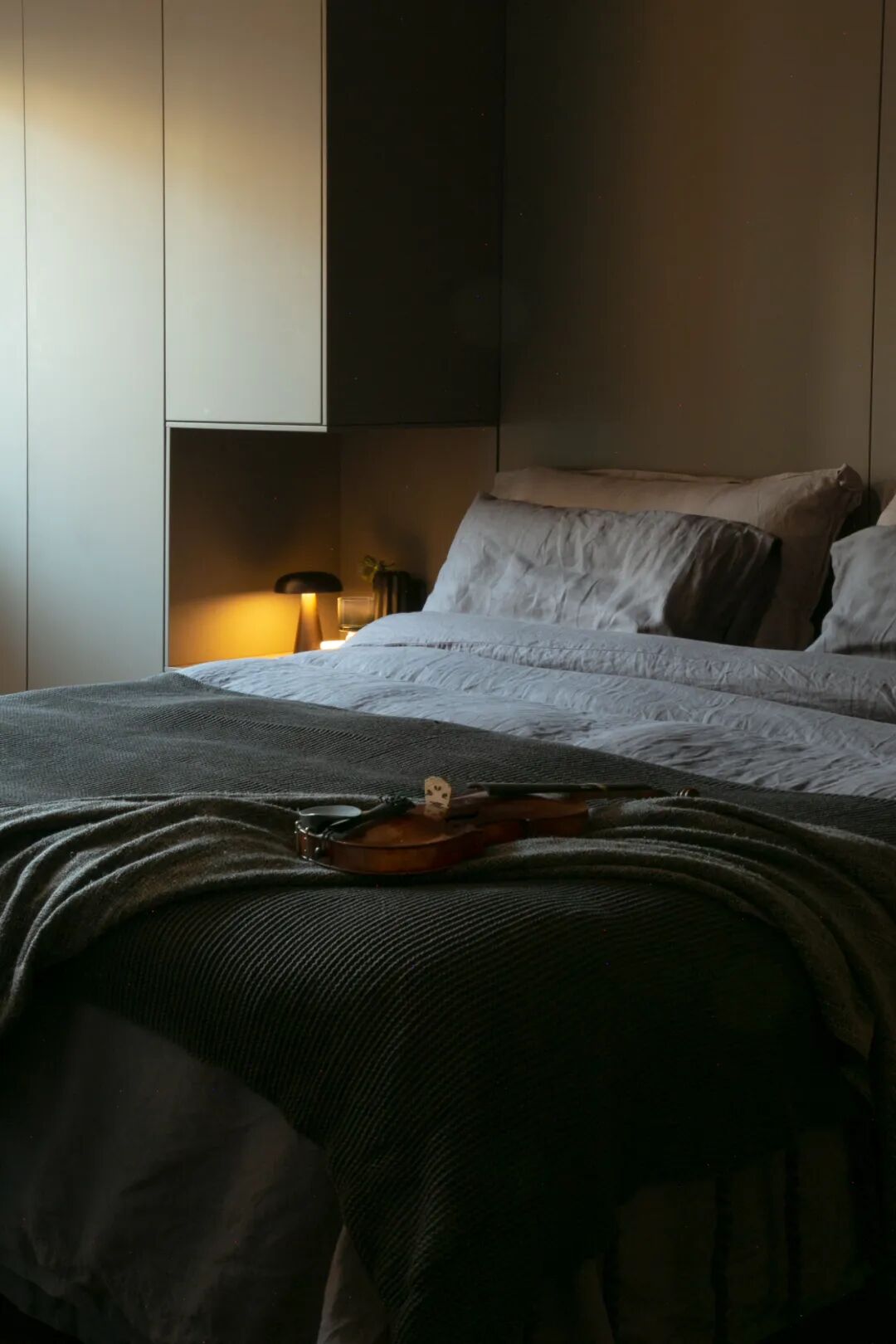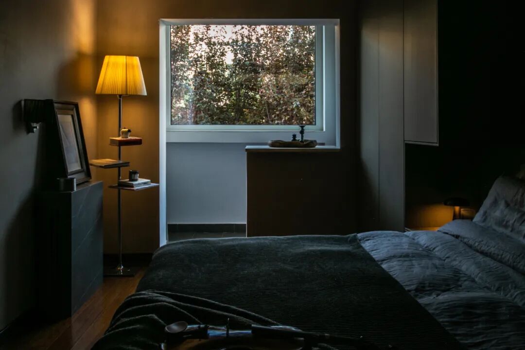 主卧很静,王左千拆掉原本密闭的阳台,用他的话说就是“拆了个洞”,墙壁充分留白后,就像北京四合院里的“照壁”:“阳光打在照壁后,会反射进房间里,以这种形式起辅助照明作用。我们的房间同理,白天光线柔和,人待着很舒服。”