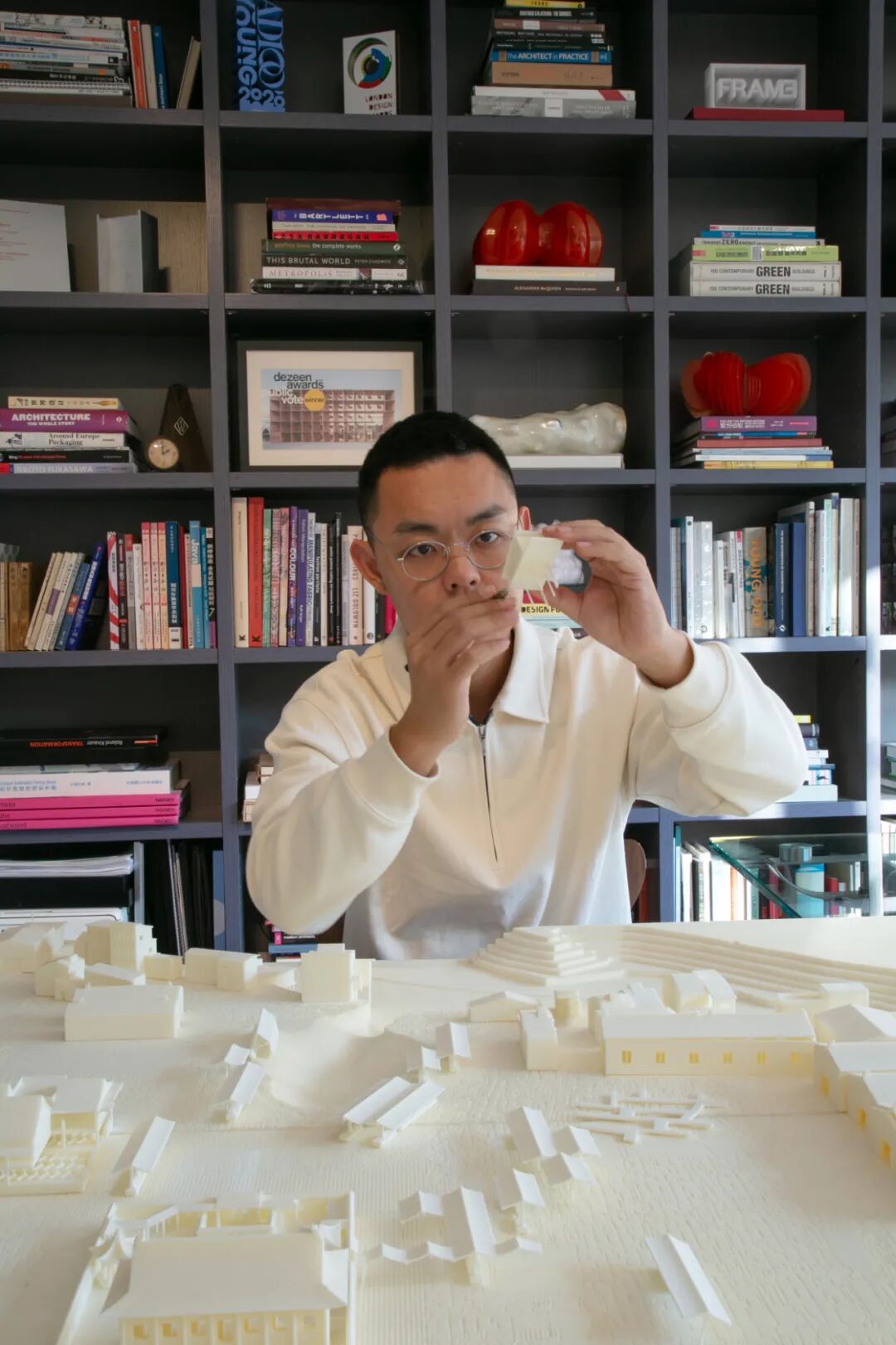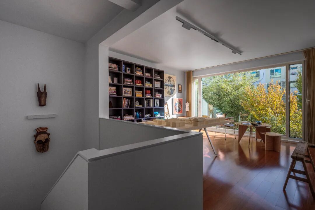沿着楼梯上2层,转角处是开放式书房。大面积的全景窗,几乎让室内面向花园的界限消失了,风景完整地渗入。书桌上排列着他曾经的项目——苏州御窑金砖厂的规划模型。