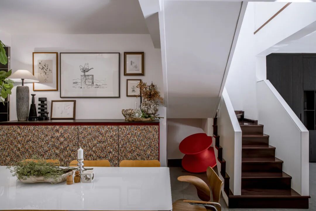 往里走,餐桌附近的彩绘冰箱柜也由王左千设计,但彩绘纹样来自艺术家作品。柜子上方挂有众多建筑师手稿,是夫妻俩从世界各地淘来的。