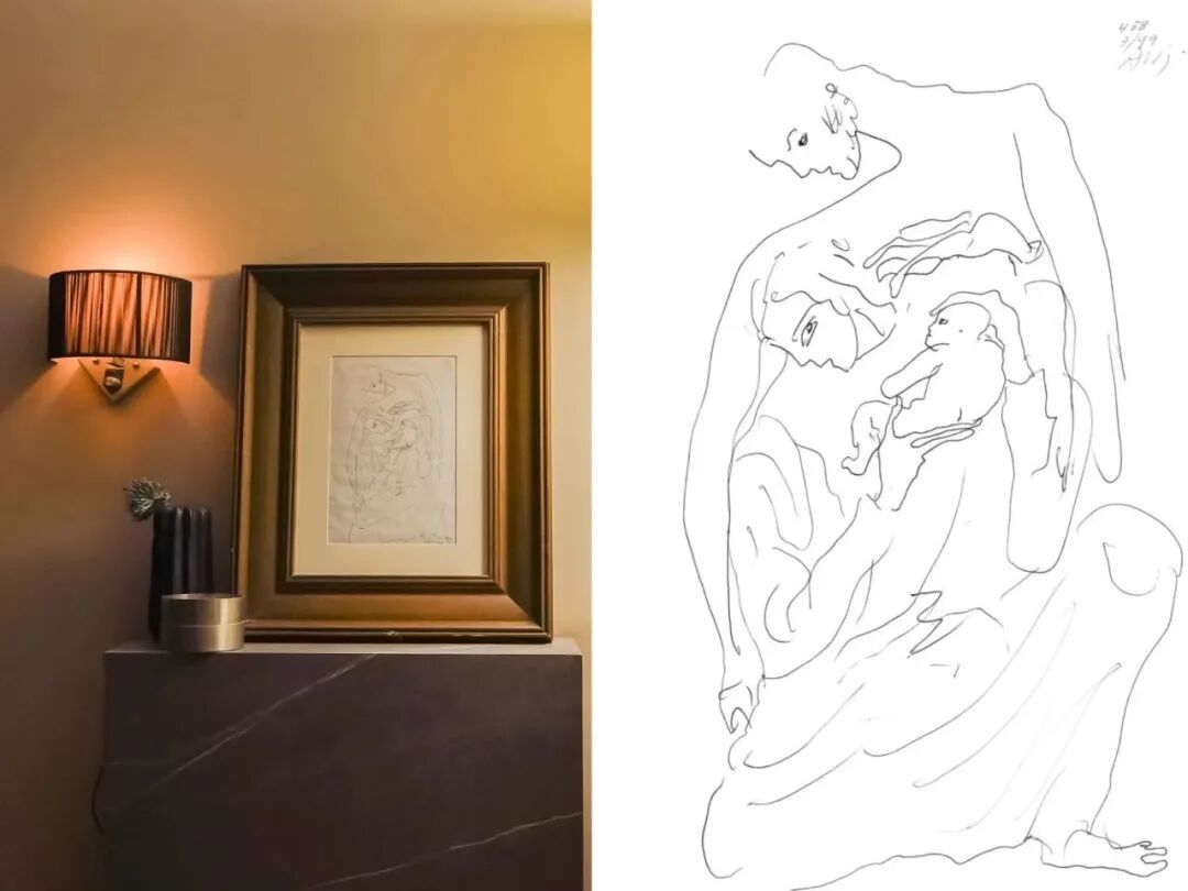 他最宝贝的,还是放在卧室的阿尔瓦罗·西扎画作。西扎是1992年普利兹克奖获得者,1998年坐在海边亲手画了这幅Family,于2020年被王左千在慈善拍卖会上拍下后,从波尔图的办公室寄出。