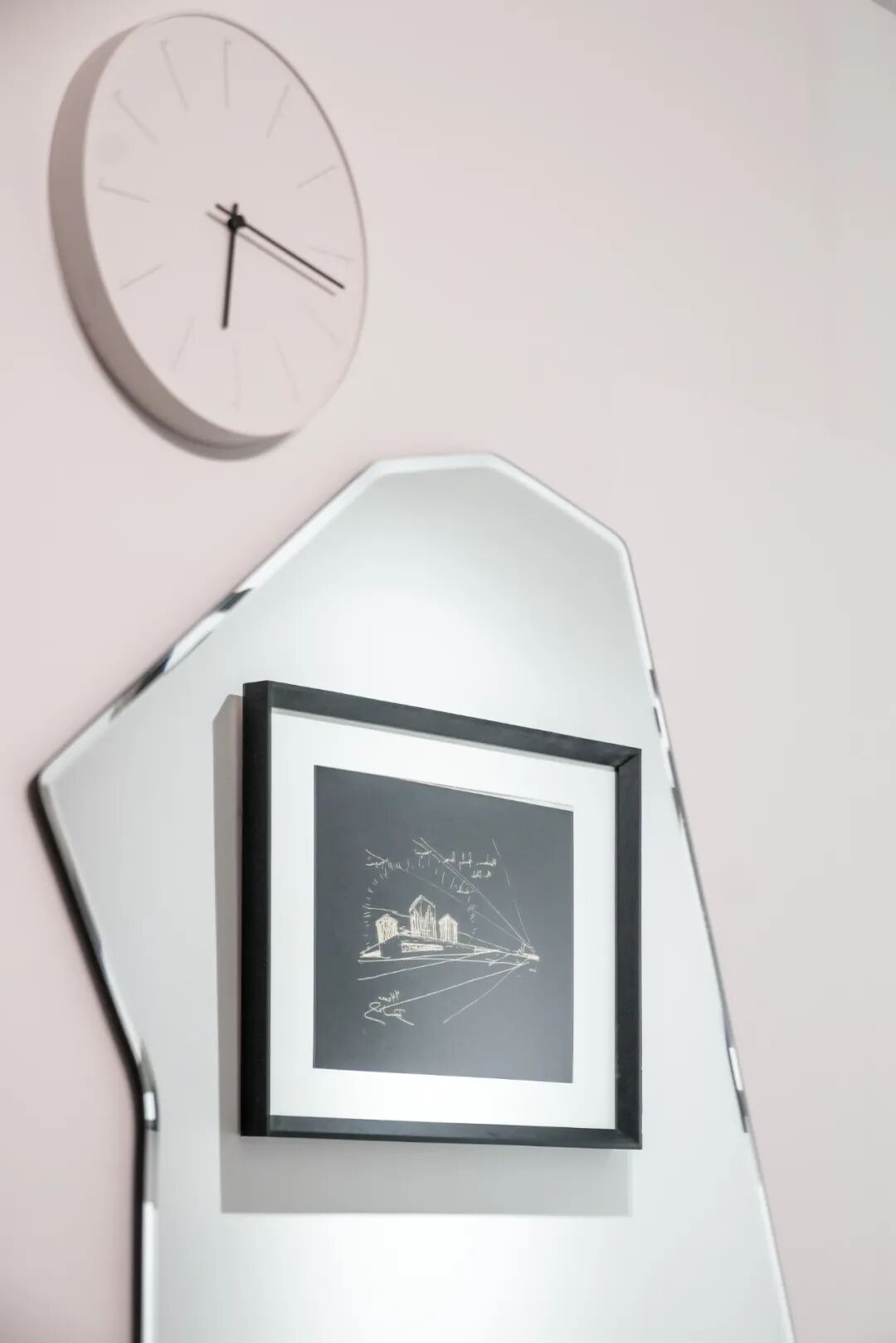 入户镜子映衬的是建筑师大卫·阿贾耶的手稿,所画建筑是他为阿拉伯联合酋长国设计的“三教神庙”,清真寺、犹太和基督教三合一,体现了不同信仰的大融合。