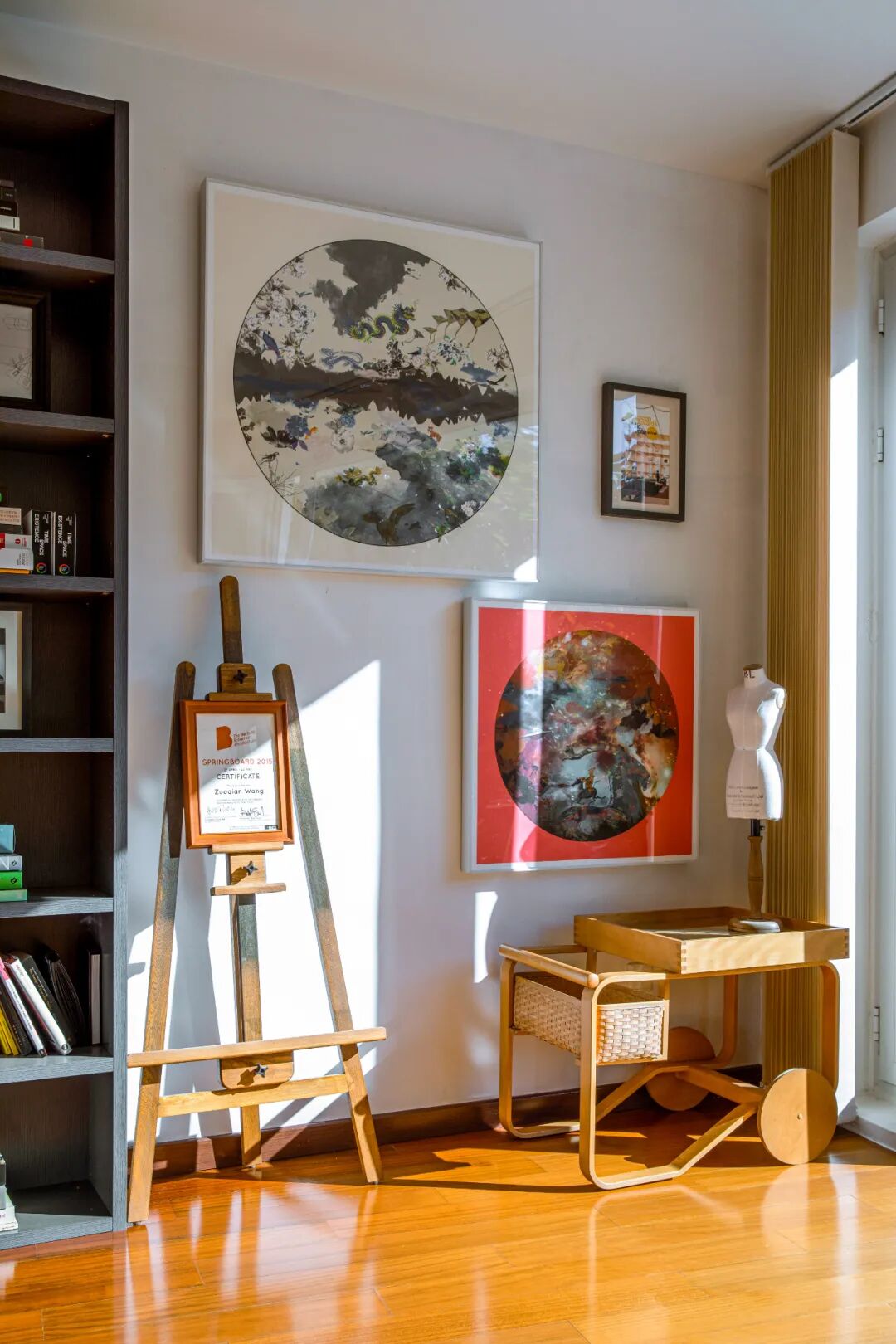 沙发后的柜体,由黑色木头定制,内嵌一小块可以翻转的背板。正面挂着陶瓷板画——1971年版达利《基督教骑士》,背面是赵无极签名的电报。