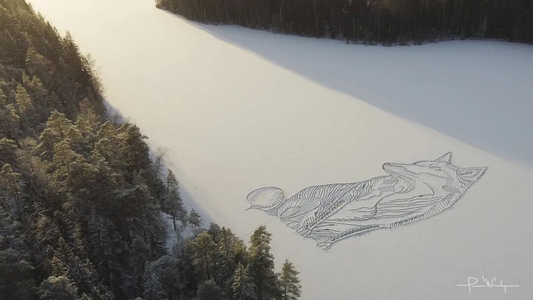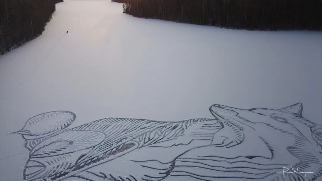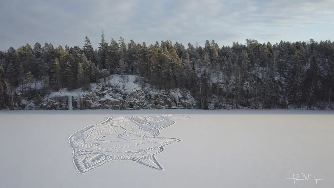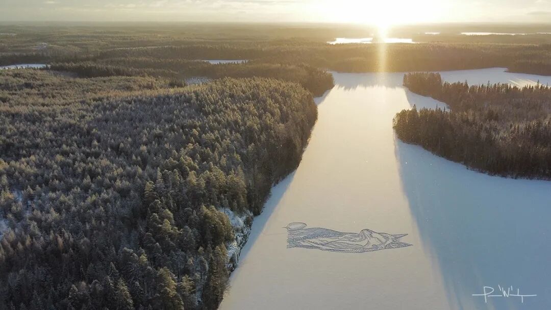 从2016年开始,这位艺术家每年都会在家乡附近的一片湖面上,创作一幅巨型雪景图,他希望看到的人能够开心,同时也希望能鼓励人们走进美丽的大自然中亲身感受。如今,已经是第6个年头了,他的年度传统已经成了该地区每个人最期待的一件事。
