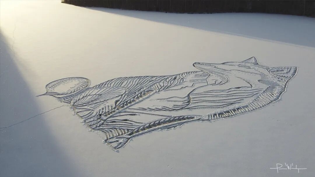 今年,帕西·威格伦“画”了一只狐狸,这只巨型狐狸身长295英尺,大约90米高,花费了4个小时的时间,完成了这幅堪称史诗级的“画作”。你一定会感到好奇,一个人是如何在雪地里画画的呢?帕西·威格伦仅仅使用双脚和一把雪铲就搞定了。这位艺术家首先通过步行的方式勾勒出狐狸的轮廓,然后用雪铲“画”剩余的部分,以及刻画细节。