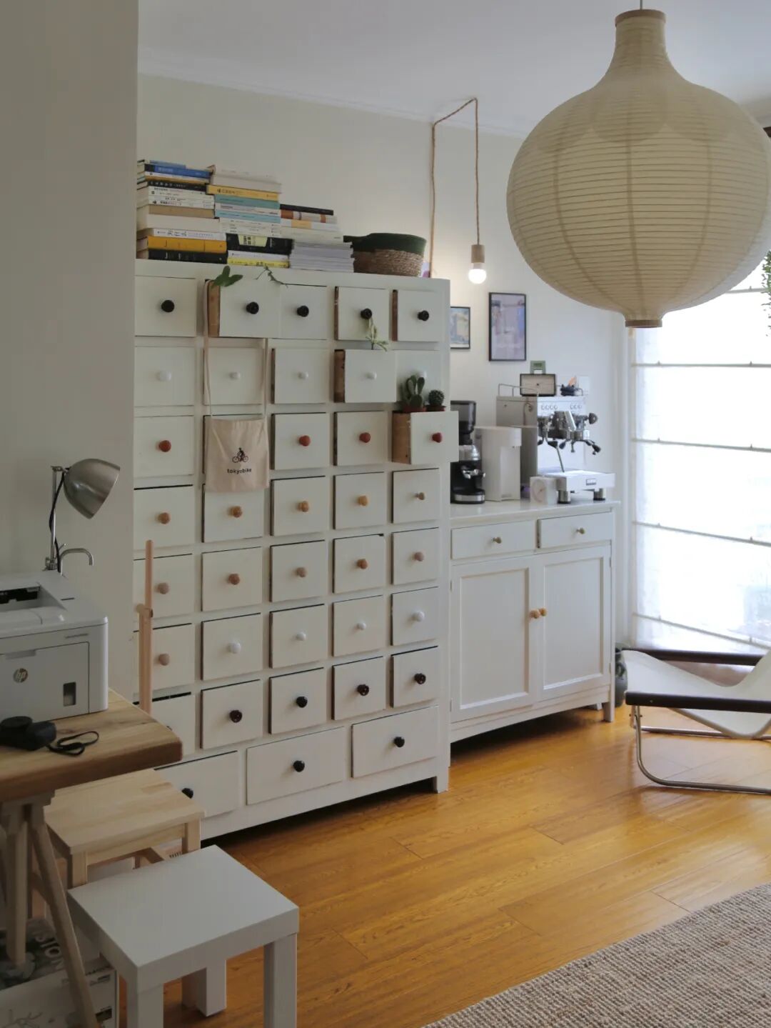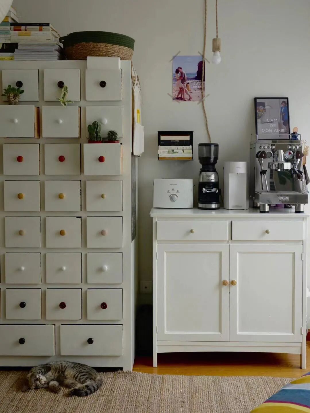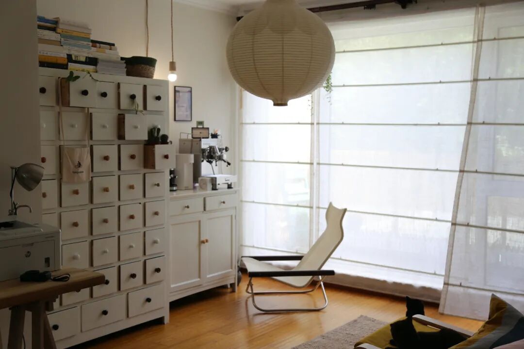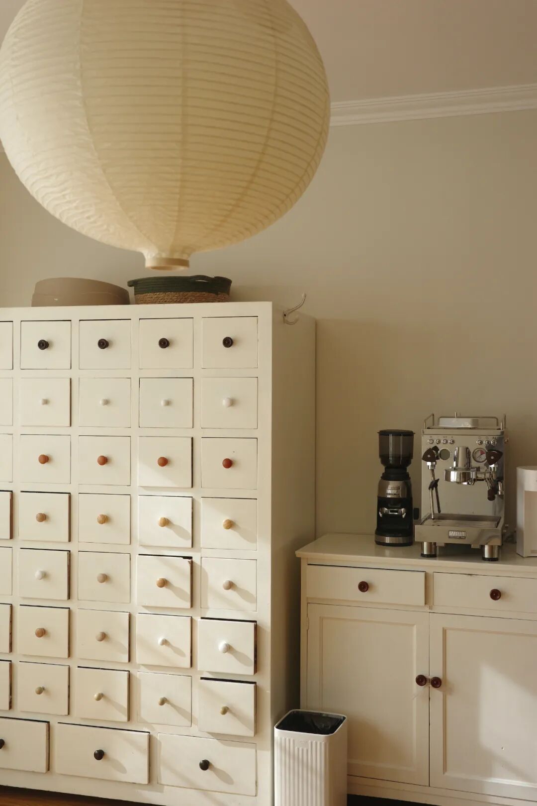客厅中药柜旁的咖啡角,由一个奶白色柜子构成,看着很现代简约,其实就是我花20块钱淘来的老柜子,刷漆改成的。