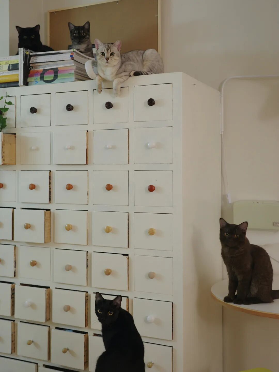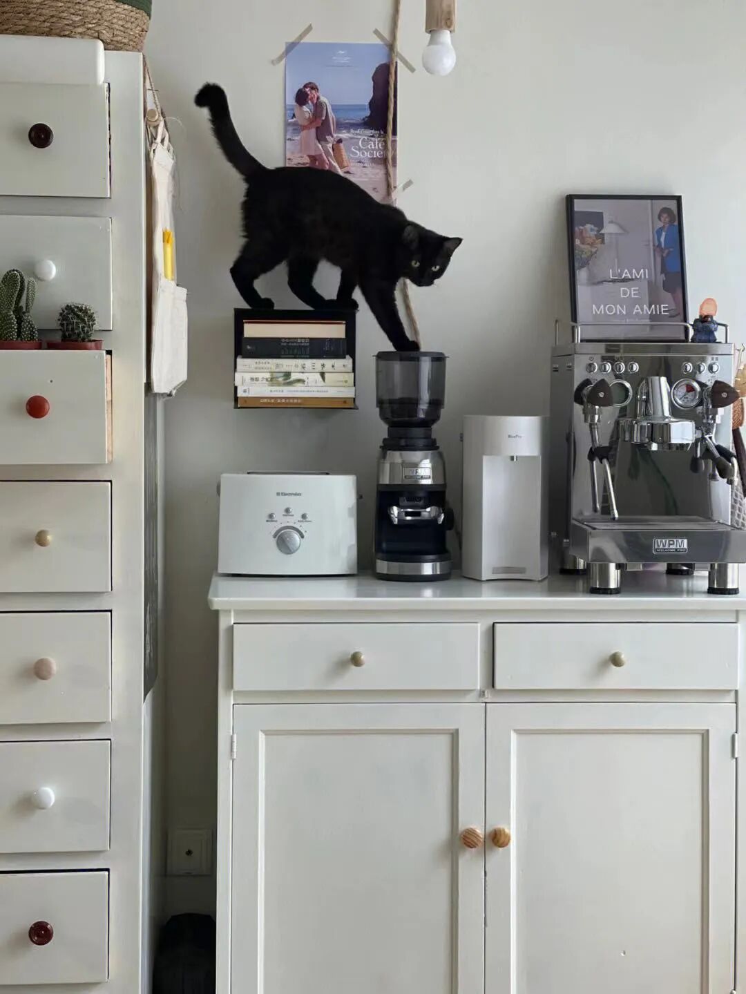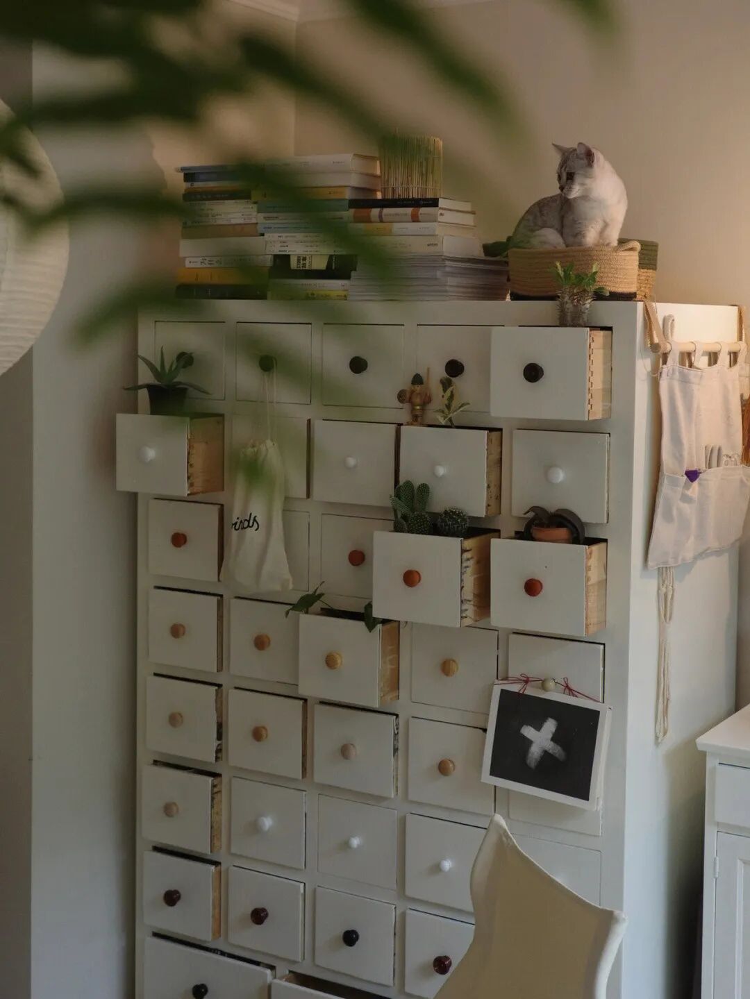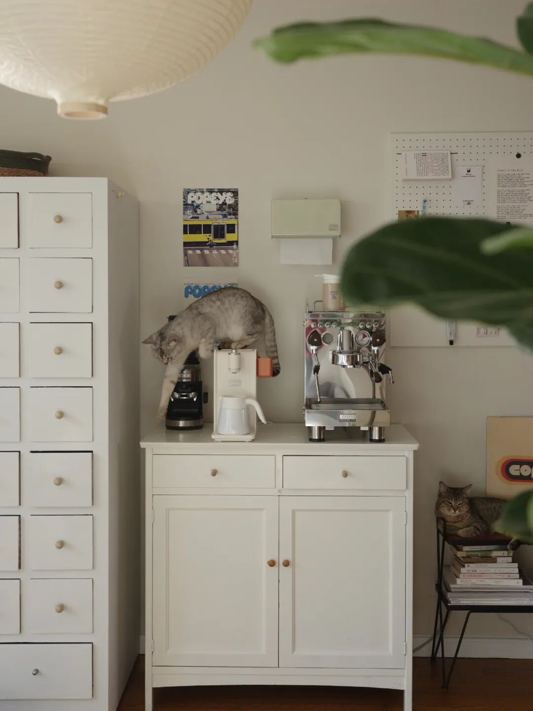 客厅中药柜旁的咖啡角,由一个奶白色柜子构成,看着很现代简约,其实就是我花20块钱淘来的老柜子,刷漆改成的。