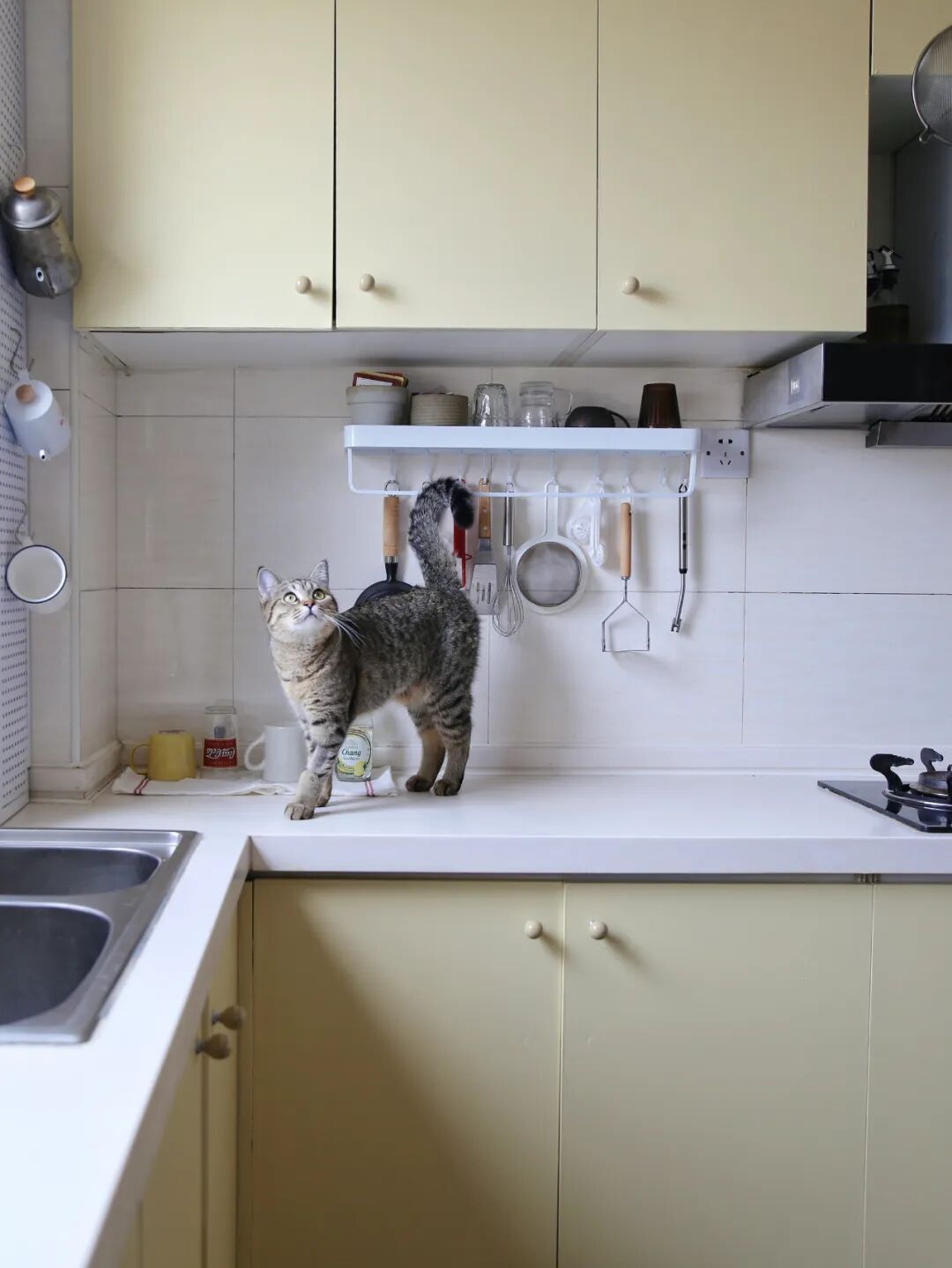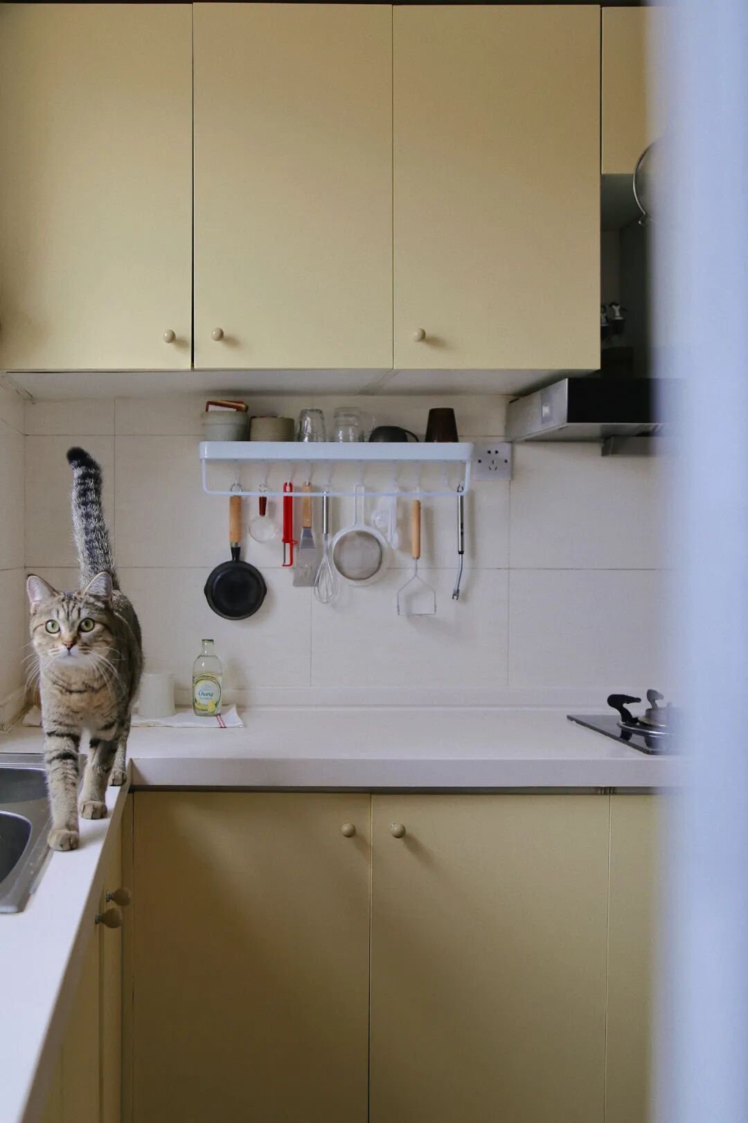 奶黄色的厨房是我刷漆改色的成果,有时拯救丑橱柜,只需要一桶漆。