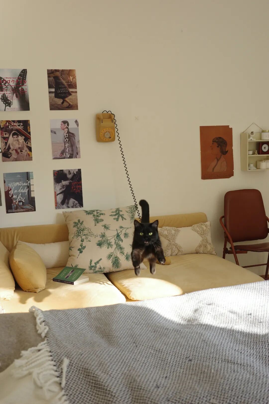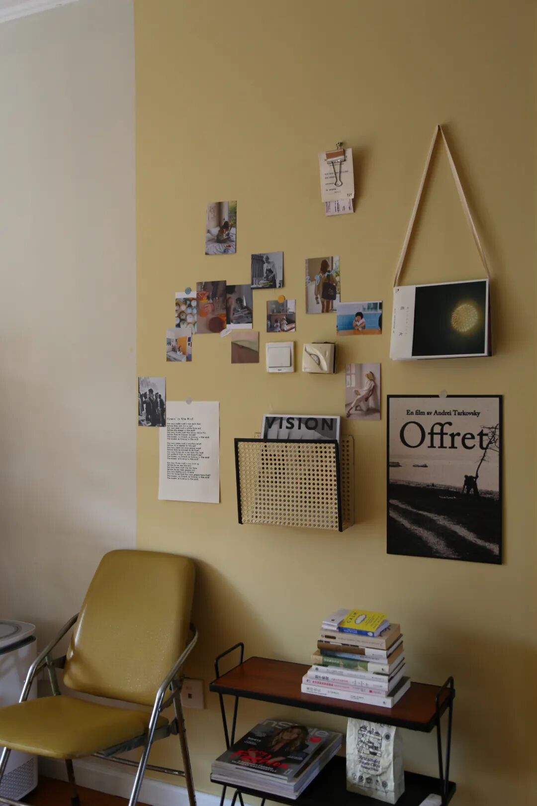 刷漆真的会上瘾,过道处的一面墙也被我刷成了复古黄,有点回到90年代的意思,我打印了些家居、摄影的灵感,贴在墙上,无痕钉钉上了一个杂志框,再摆上淘来的二手老破椅,这变成了“一平米的美丽角落”