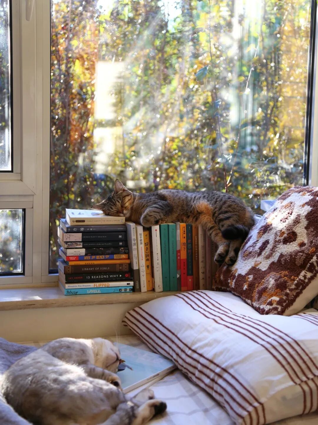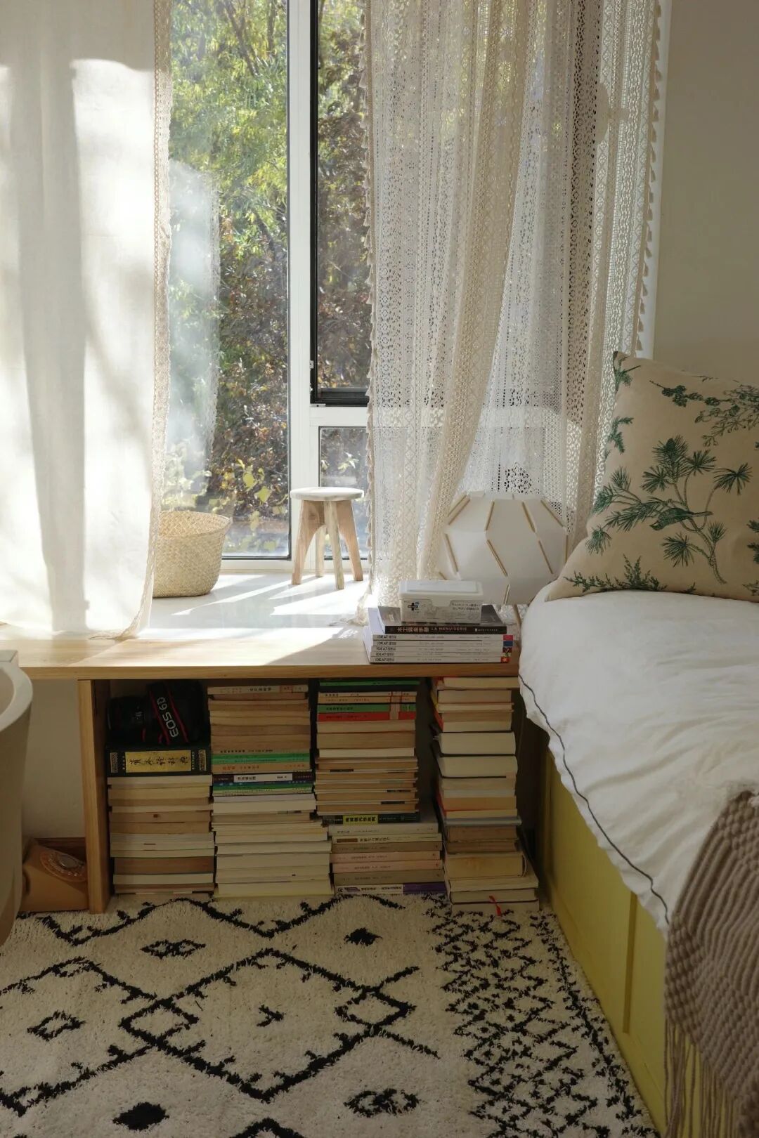床头自己打了低矮的书架,收拾了我常读的书籍,泛黄的书页,倒也成了家的装饰。