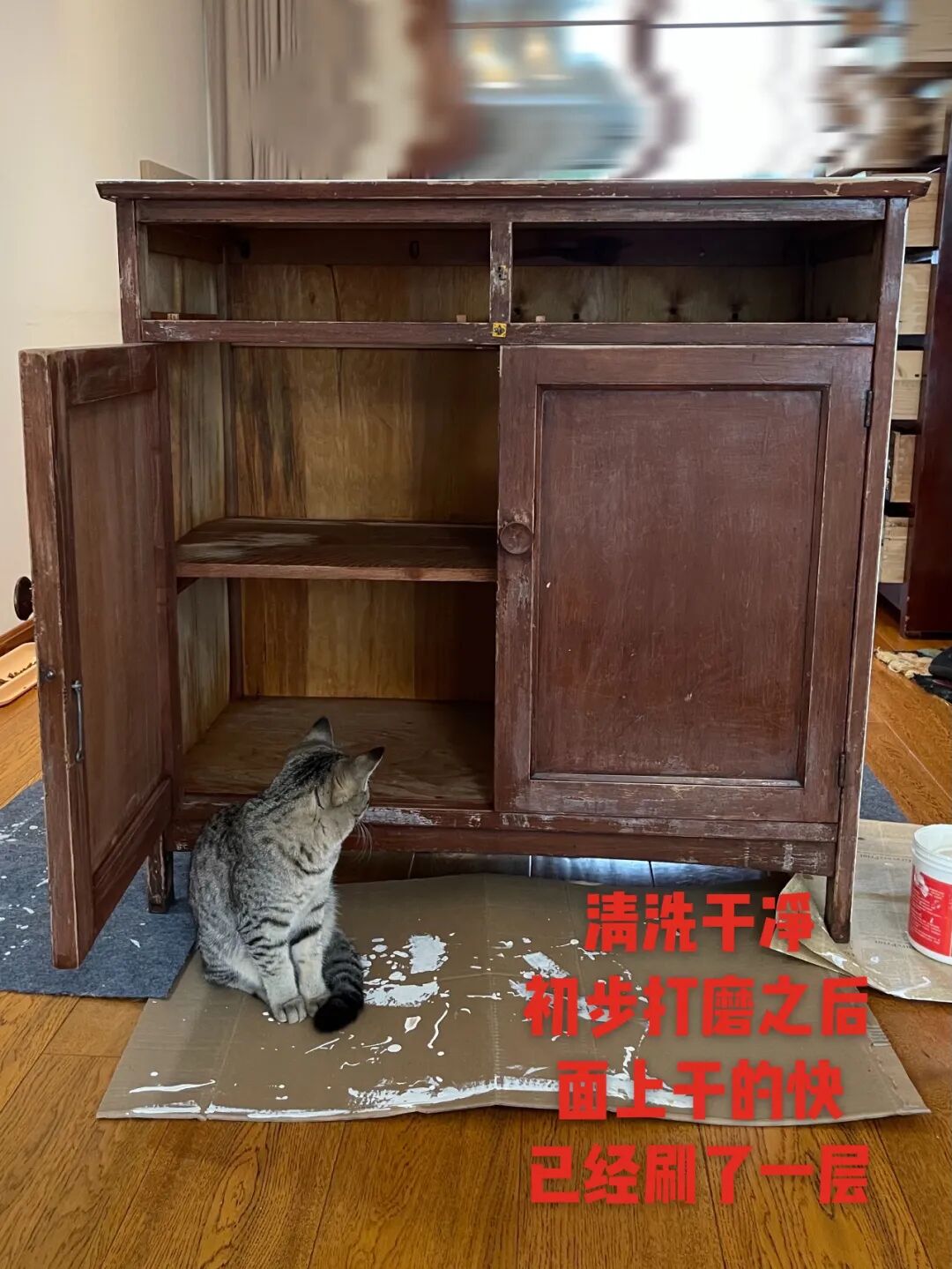 先清理干净残余的油污,这次是上了一遍白底漆,没有打磨。柜门外侧4遍面漆,内侧2遍面漆。