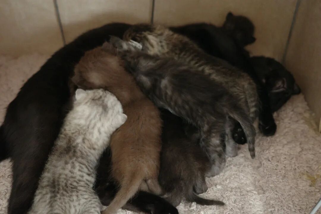 去做产检,医生预测大约能生四到五胎,哈哈,我信他个鬼。到了真正接生的那天,我一只一只地接出来,数了数有六只,猫妈妈都快生不动了,我摸摸它肚子,天啊,又生了一只。