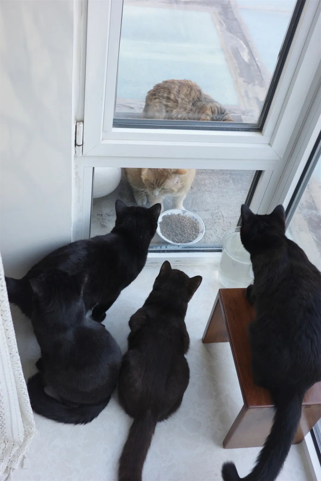 ▼猫崽子们在围观流浪猫