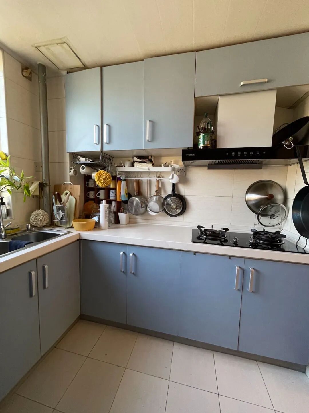 除了刷柜子,我还动手把厨房给刷了。厨房不算旧,但也有些年头,橱柜和瓷砖实在是太丑了,我用“刷漆+瓷砖贴”的方法拯救了它。