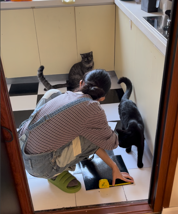 地砖贴上黑白色的瓷砖贴,便有了“奶黄+棋盘格”的效果,真的很复古!