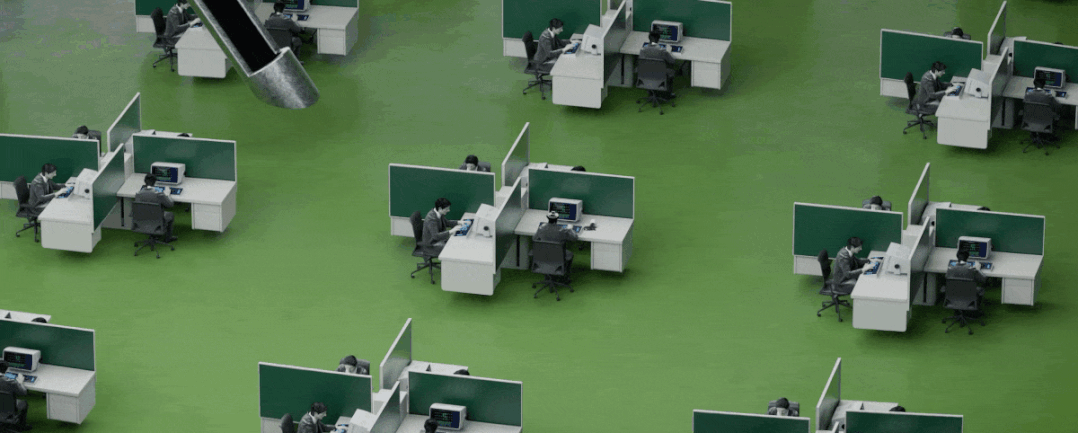 如同无限复制的四格工位上坐着相差无几的员工,竟然被吸尘器一把吸走,搅拌,榨成沥青一样的黑色黏稠物质。