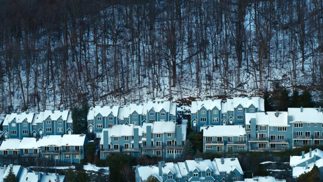 大量极简对称的几何构图,为这个被大雪覆盖的小镇,平添了几分美感