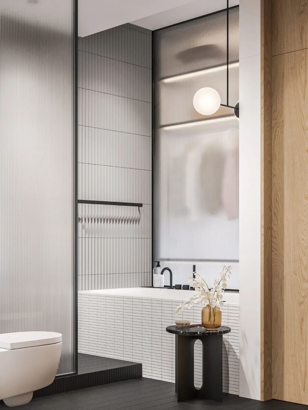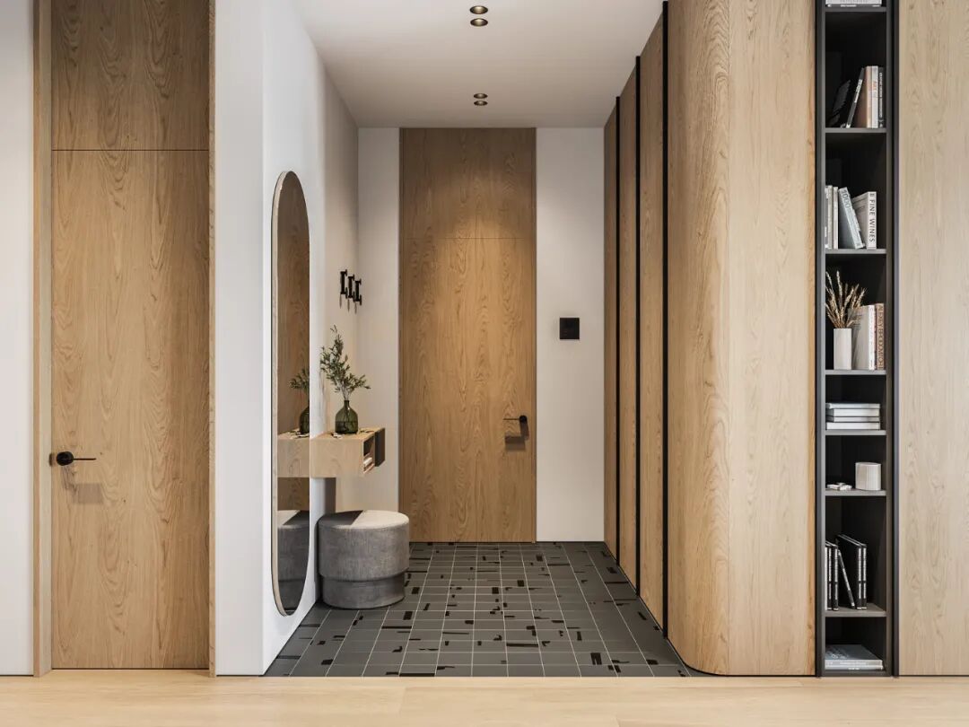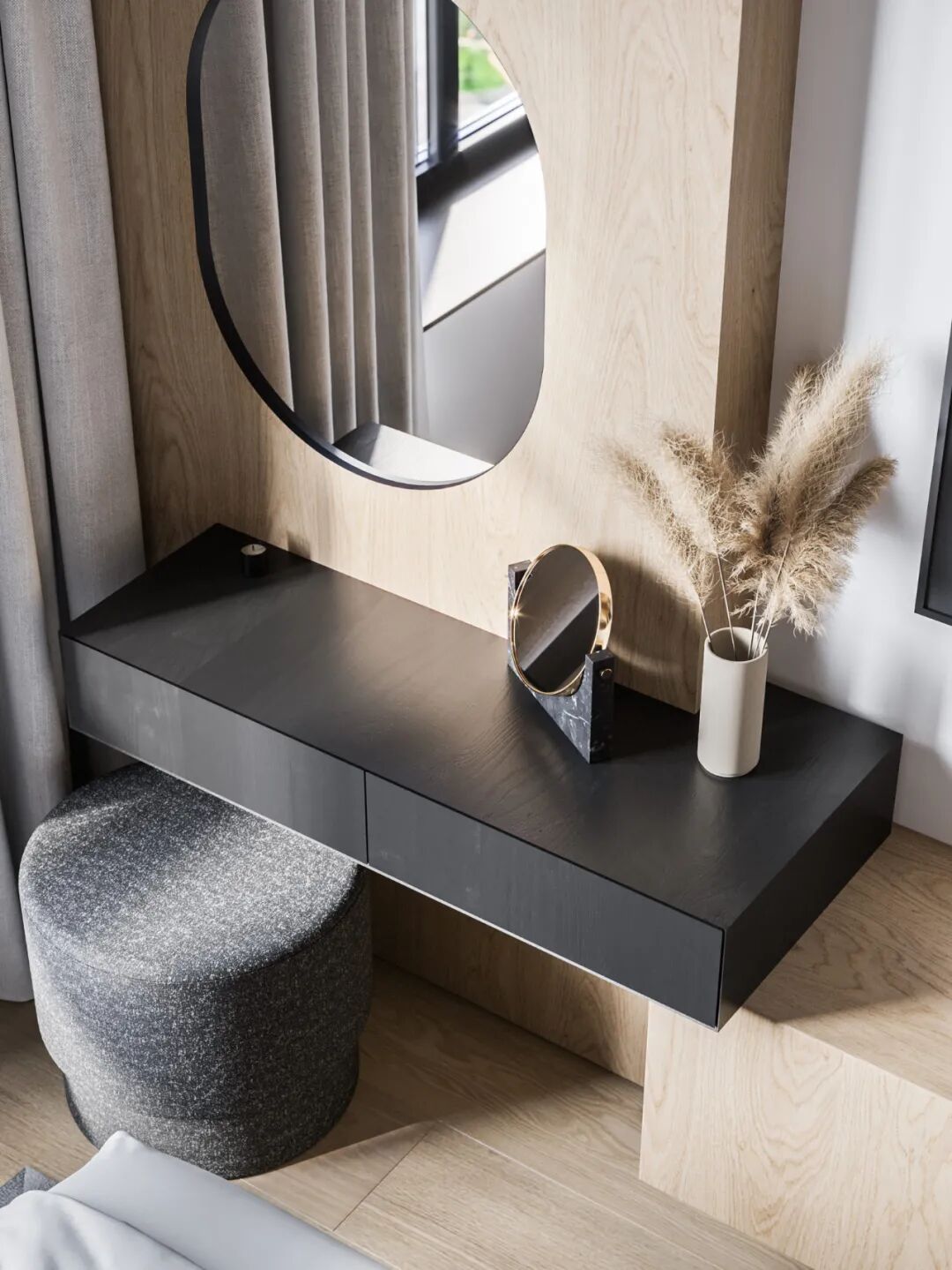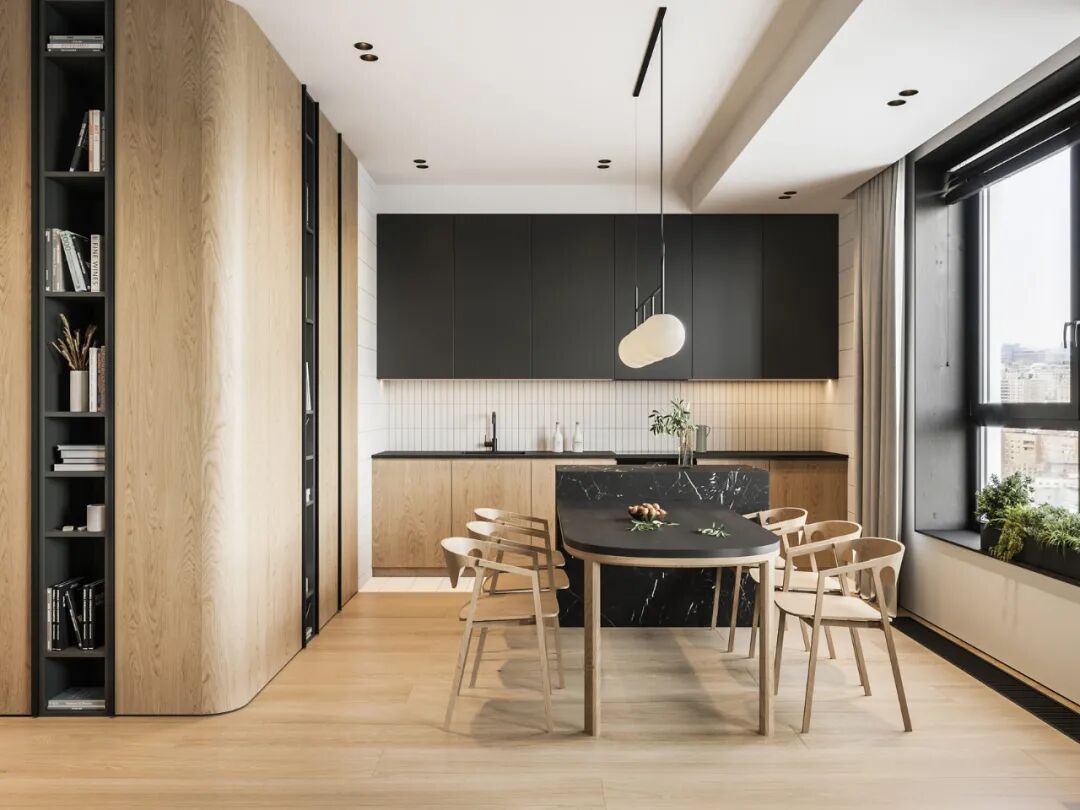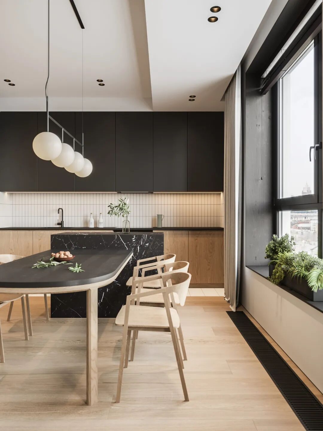 这个公寓位于莫斯科 面积为 92.4㎡是 BUREAU SLOVO 的新作在整个家中设计师将木材作为主材料用于家具和装饰上还加入圆形元素来优化空间线条△BUREAU SLOVO玄关利用深色的瓷砖铺贴地面划分出区域时尚又现代的异形镜子搭配灰色沙发凳墙面选用白色+木饰面设计不过分雕琢的自然素材让层次感与格调兼备客厅同样大量的使用木元素设计师还选择了一款与木色接近的沙发以起到色调统一的效果加上黑色的茶几、几何图案的地毯、绿植点缀给人带来简约素雅的温馨感定制的电视柜集收纳于一体靠窗位置的开放式黑色书架也可么作为展示柜使用 为了优化空间和提高空间利用率设计师在餐厨之间采用了一体设计黑色与木饰面的吊柜 大量的储物空间满足了收纳需求颜色上也形成鲜明对比