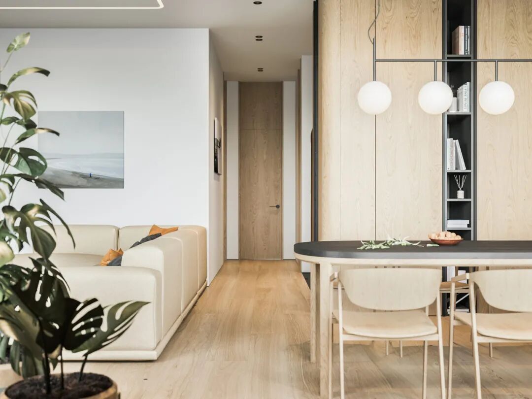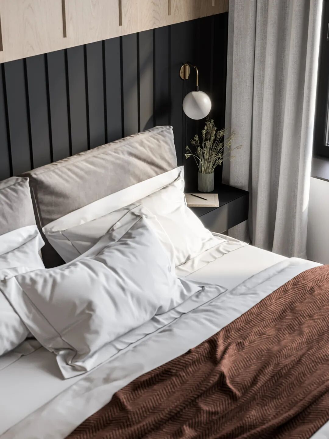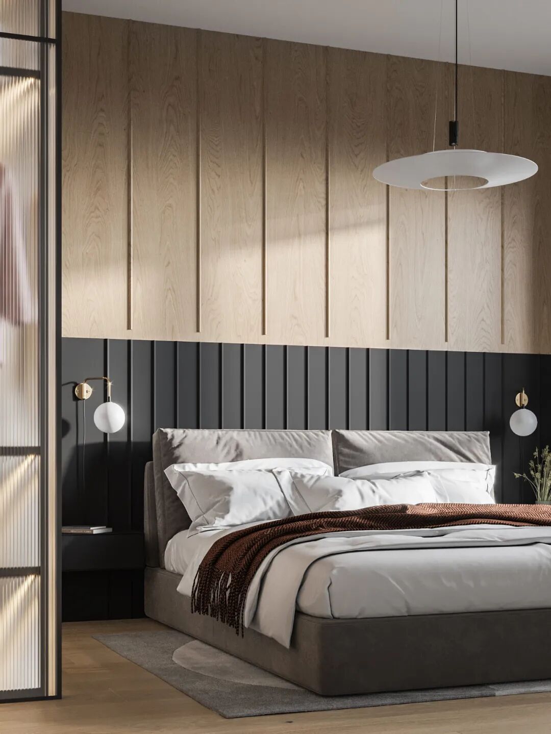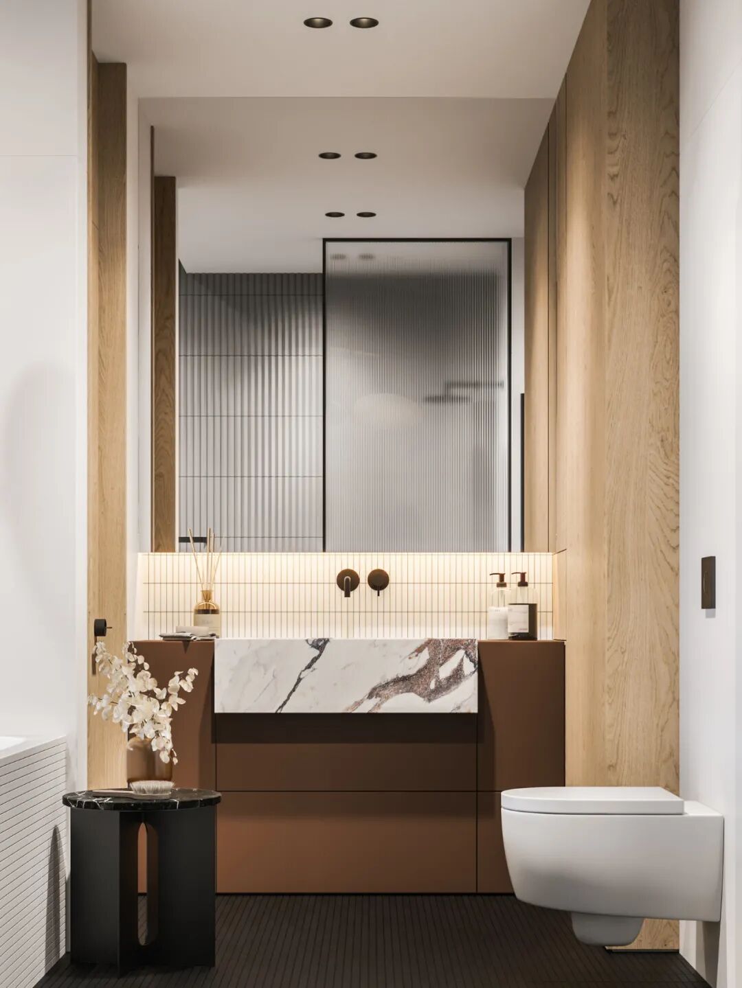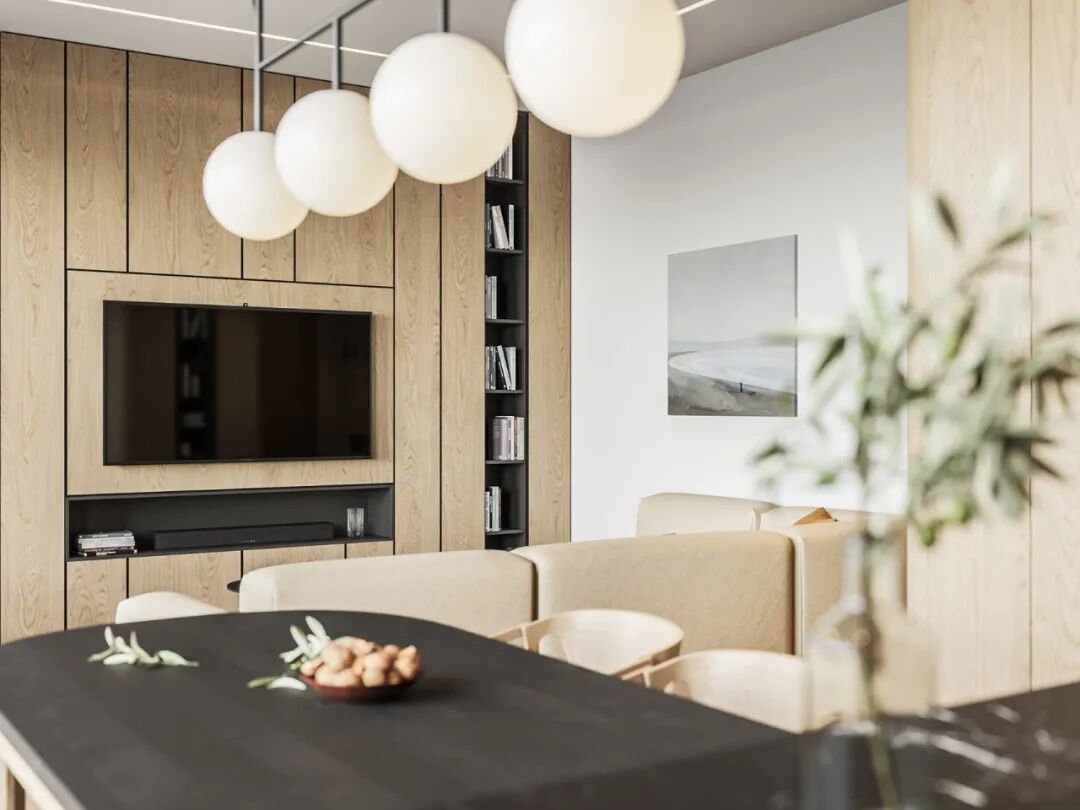 这个公寓位于莫斯科 面积为 92.4㎡是 BUREAU SLOVO 的新作在整个家中设计师将木材作为主材料用于家具和装饰上还加入圆形元素来优化空间线条△BUREAU SLOVO玄关利用深色的瓷砖铺贴地面划分出区域时尚又现代的异形镜子搭配灰色沙发凳墙面选用白色+木饰面设计不过分雕琢的自然素材让层次感与格调兼备客厅同样大量的使用木元素设计师还选择了一款与木色接近的沙发以起到色调统一的效果加上黑色的茶几、几何图案的地毯、绿植点缀给人带来简约素雅的温馨感定制的电视柜集收纳于一体靠窗位置的开放式黑色书架也可么作为展示柜使用 为了优化空间和提高空间利用率设计师在餐厨之间采用了一体设计黑色与木饰面的吊柜 大量的储物空间满足了收纳需求颜色上也形成鲜明对比