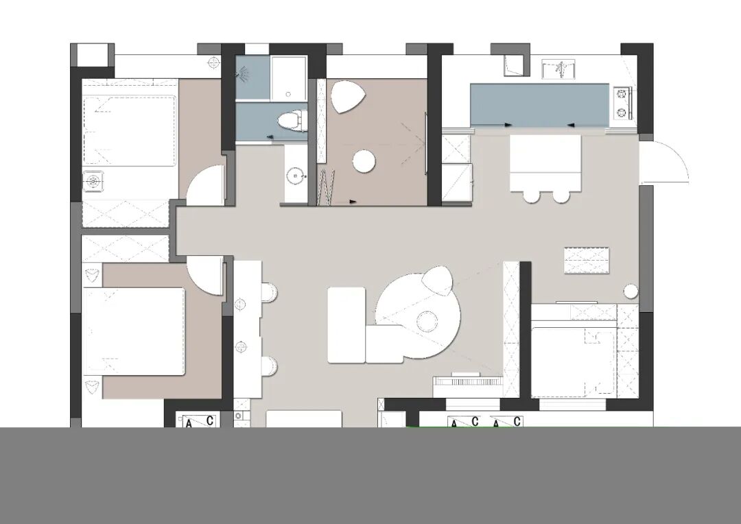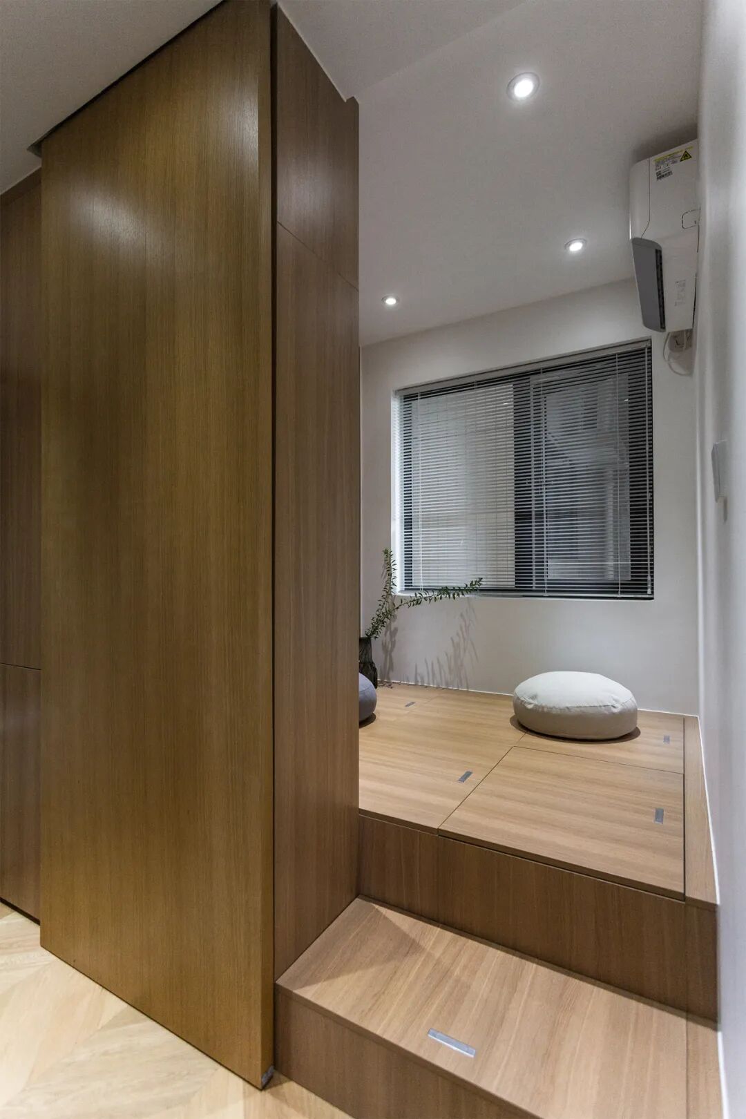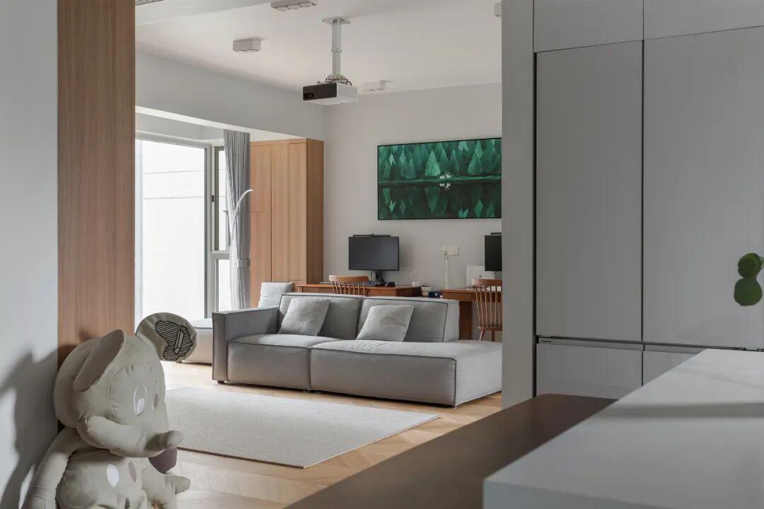 ◆公共休闲区按需优化。家中常住人口为二人,不需要太多的房间;业主喜欢玩桌游和电玩,偶尔还会有朋友们一起来玩。所以我们把最中间的房间改造成游戏房,既作为专用空间来玩耍,又与起居室连通,开阔通透。