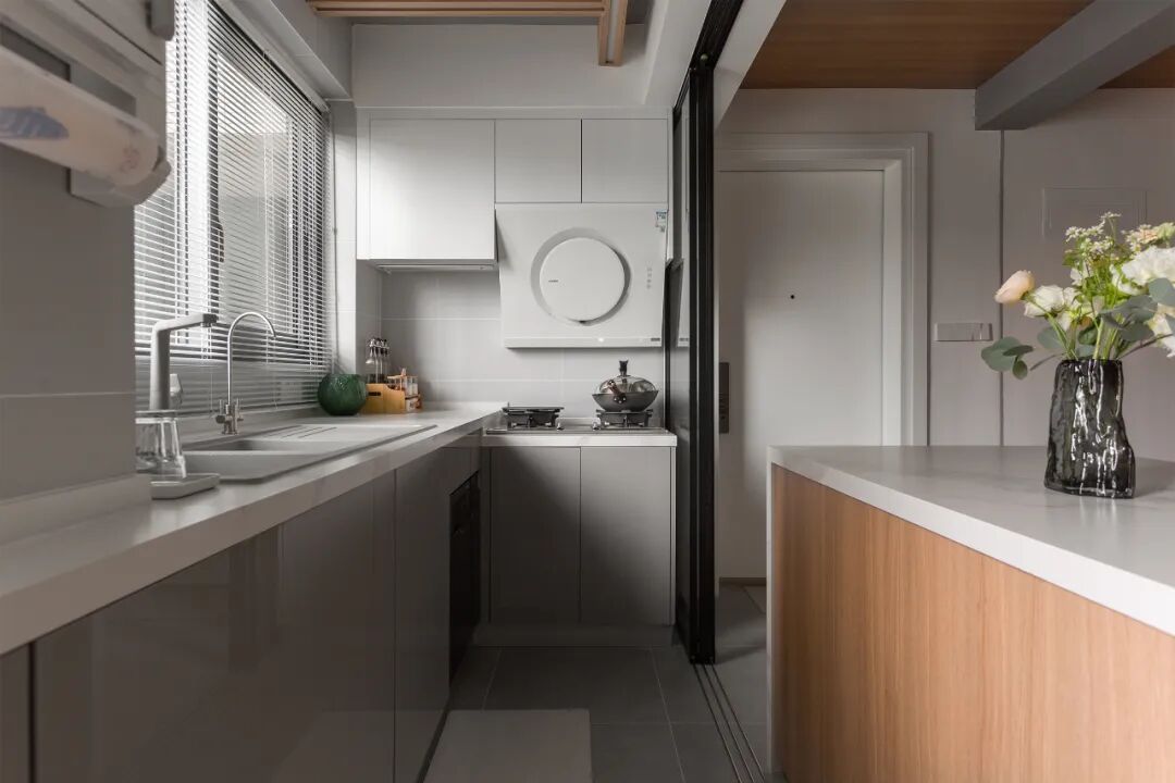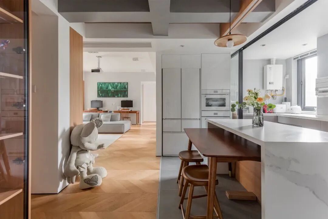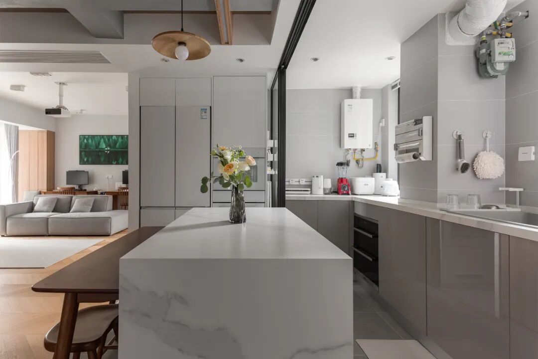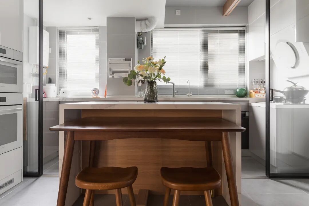 这套93㎡的房子位于广东广州,业主喜欢烹饪,喜欢参与家里的每一项活动。设计师利用入户花园做成开放式餐厨区,U型操作台+中岛形成洄游动线,明亮宽裕的空间可容纳多人,使用起来也更舒适,做饭也变成一件很享受的事情。