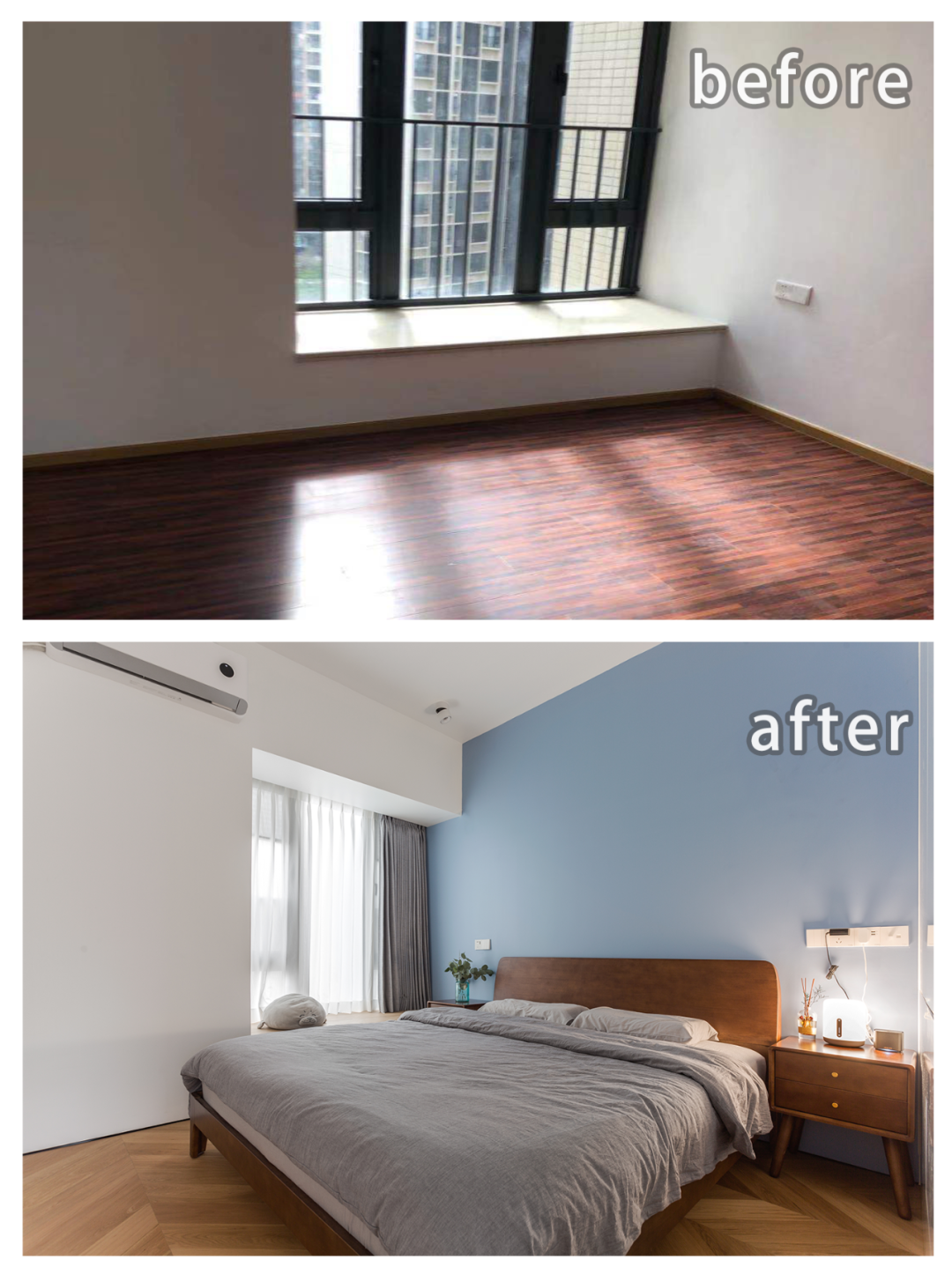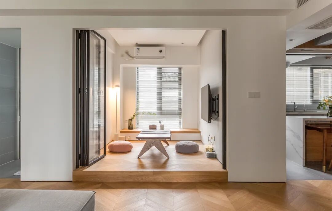 天用设计:全屋做无地脚线设计,只用1cm高的不锈钢收边;加上鱼骨形木地板通铺,干净清新,简约大气。