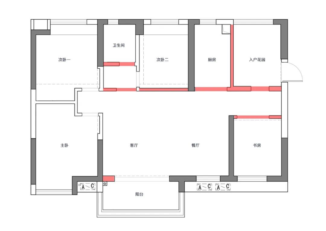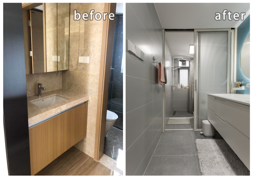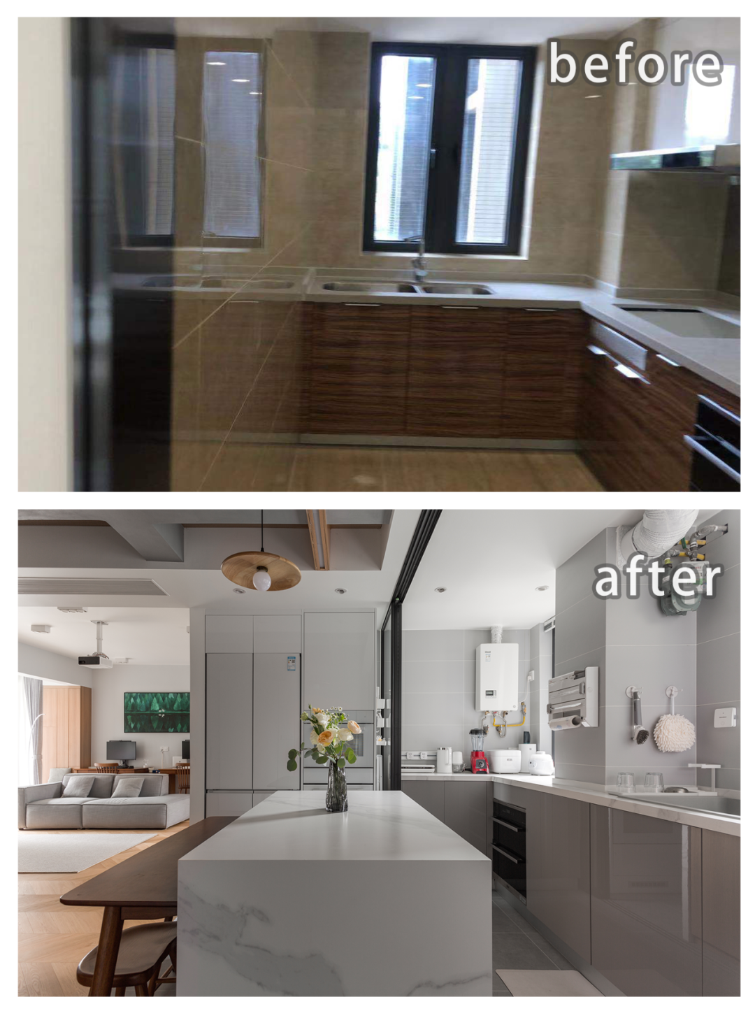 ◆餐厨区一体化改造。原厨房是狭长的长方形,只能做L型操作台,多人走动的话不方便,无法满足业主对于厨房的需求。将入户花园并入厨房,面积增至原厨房的2.5倍,并做成开放式餐厨区。宽U型操作台+中岛+洄游动线,明亮宽裕的空间和充分自然的交流氛围,让做饭变成一件享受的事情。