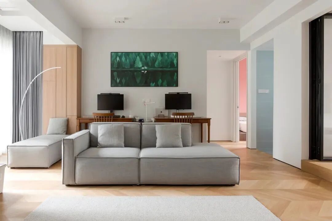 天用设计:起居室将原客厅和餐厅作为一个整体,构成开阔疏朗、风光流通的开放空间。组合式沙发可以根据实际需求设计造型;办公区的实木双人书桌让彼此更有交流和陪伴的时间。