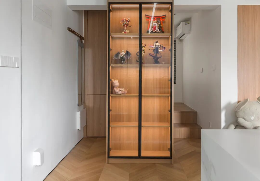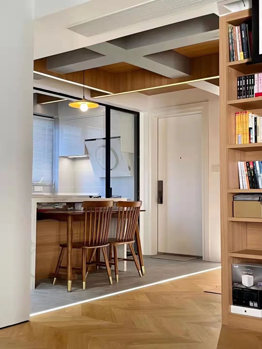 天用设计:进门第一眼是餐厨区,而玄关区移至展示柜后面,避开视线的直视范围,确保好看美观的形象。