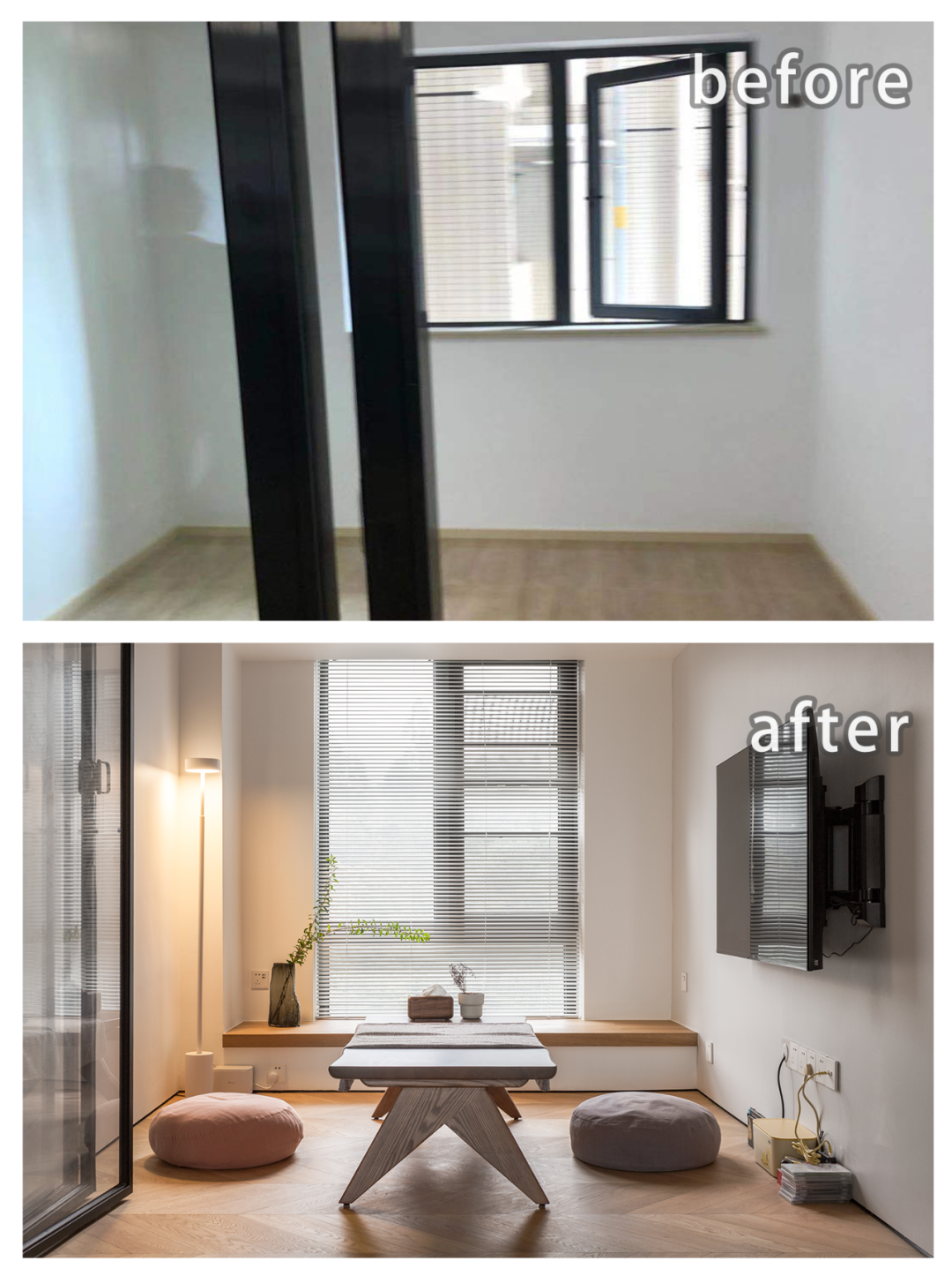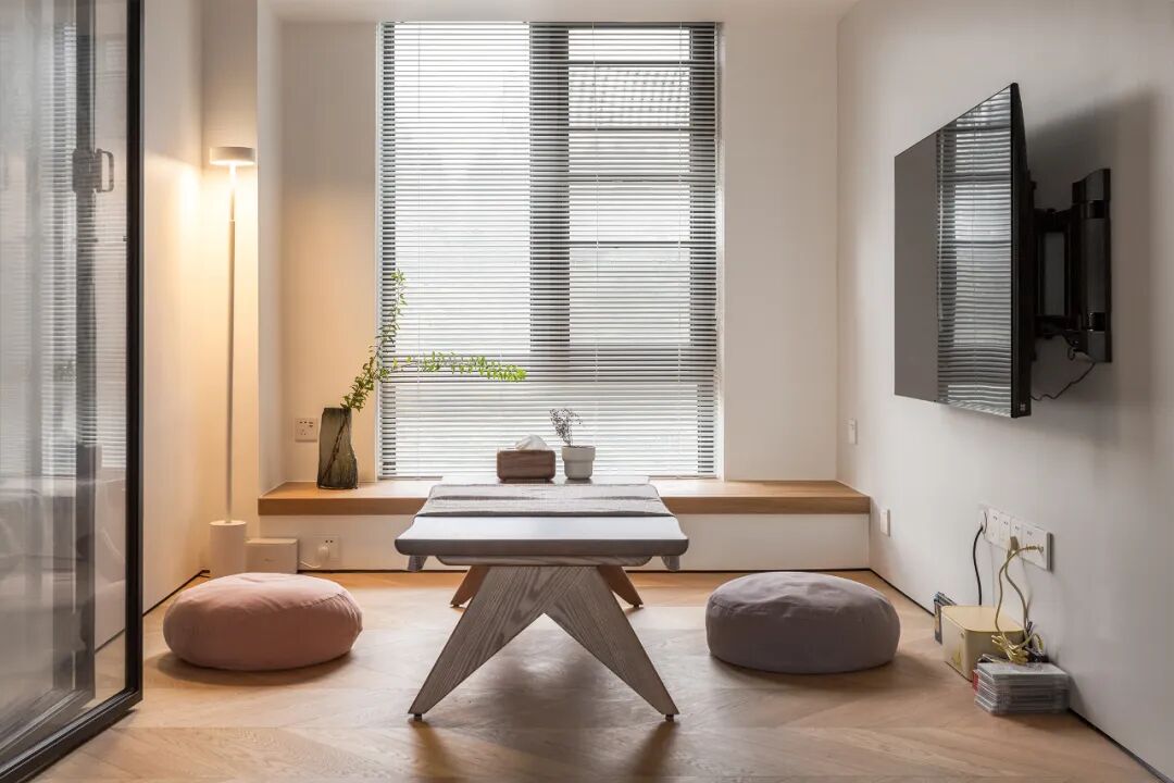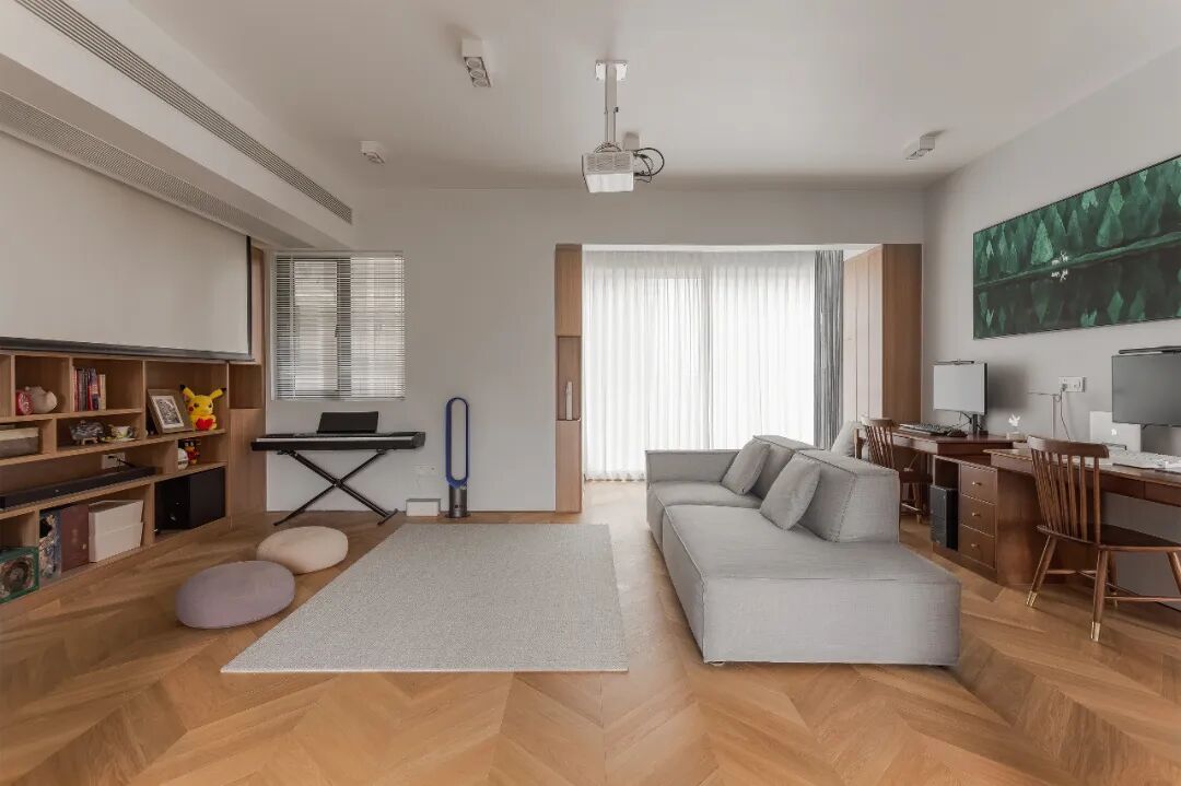 天用设计:恩爱夫妻有着各式各样秀恩爱的方式,比如告诉设计师,要留一间游戏室,夫妻俩打怪升级。游戏室抬高地台10cm左右,使之与其他空间区分开来。电视用了180°电视架,不管是在游戏室还是起居室,都能选择想要的观影/游戏模式。