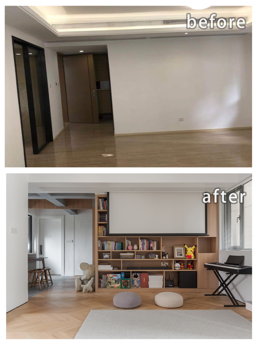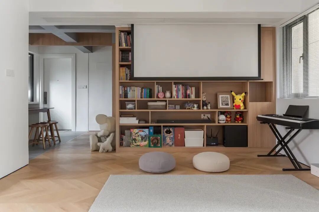 天用设计:书架、投影仪、电子钢琴等等,这些丰富多彩的休闲娱乐,展现了业主们宝藏般的内心世界。