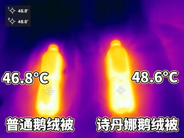 我们拿两个装有50℃热水的瓶子,分别放在诗丹娜鹅绒被和普通被子中。