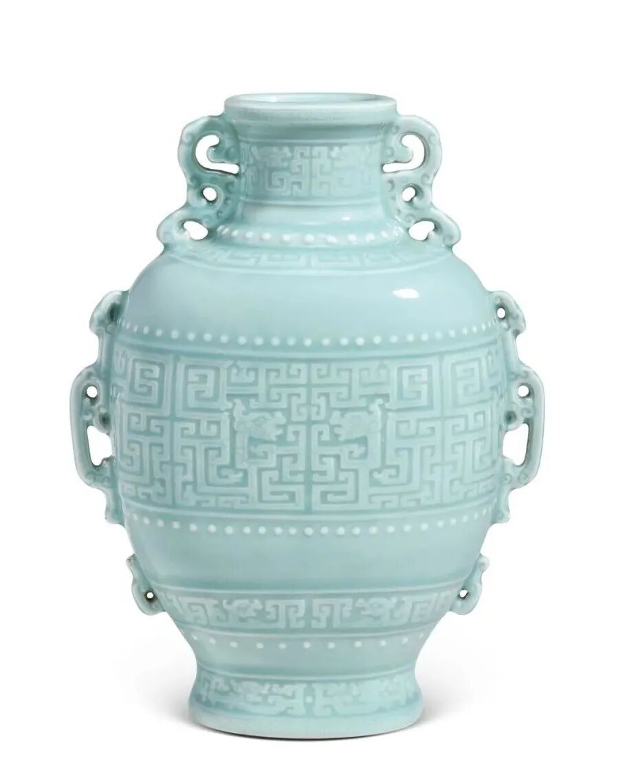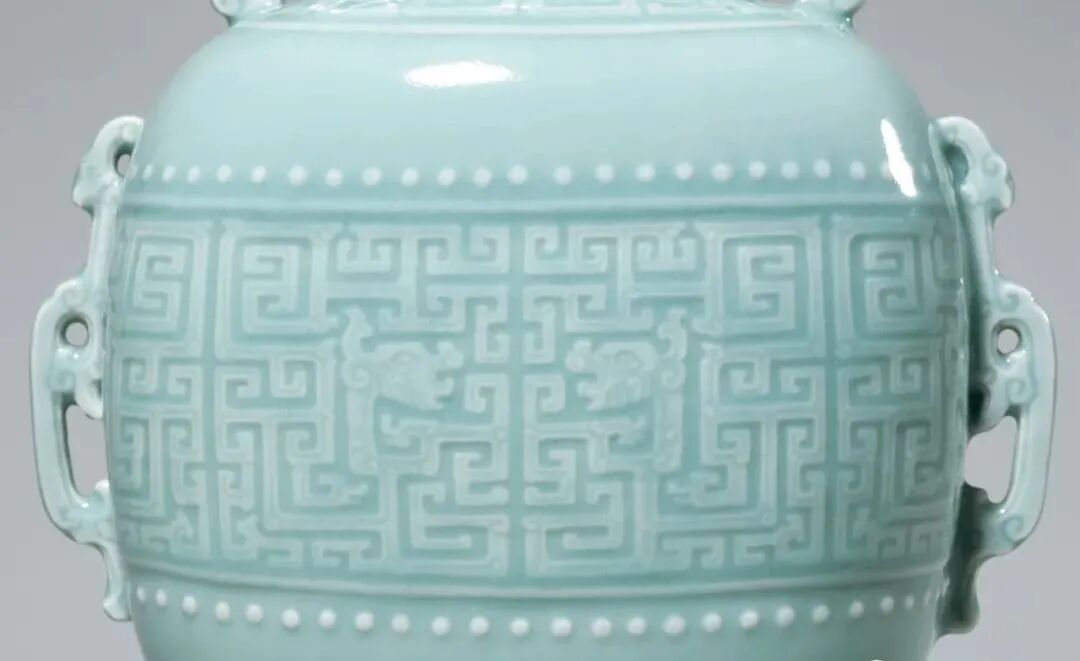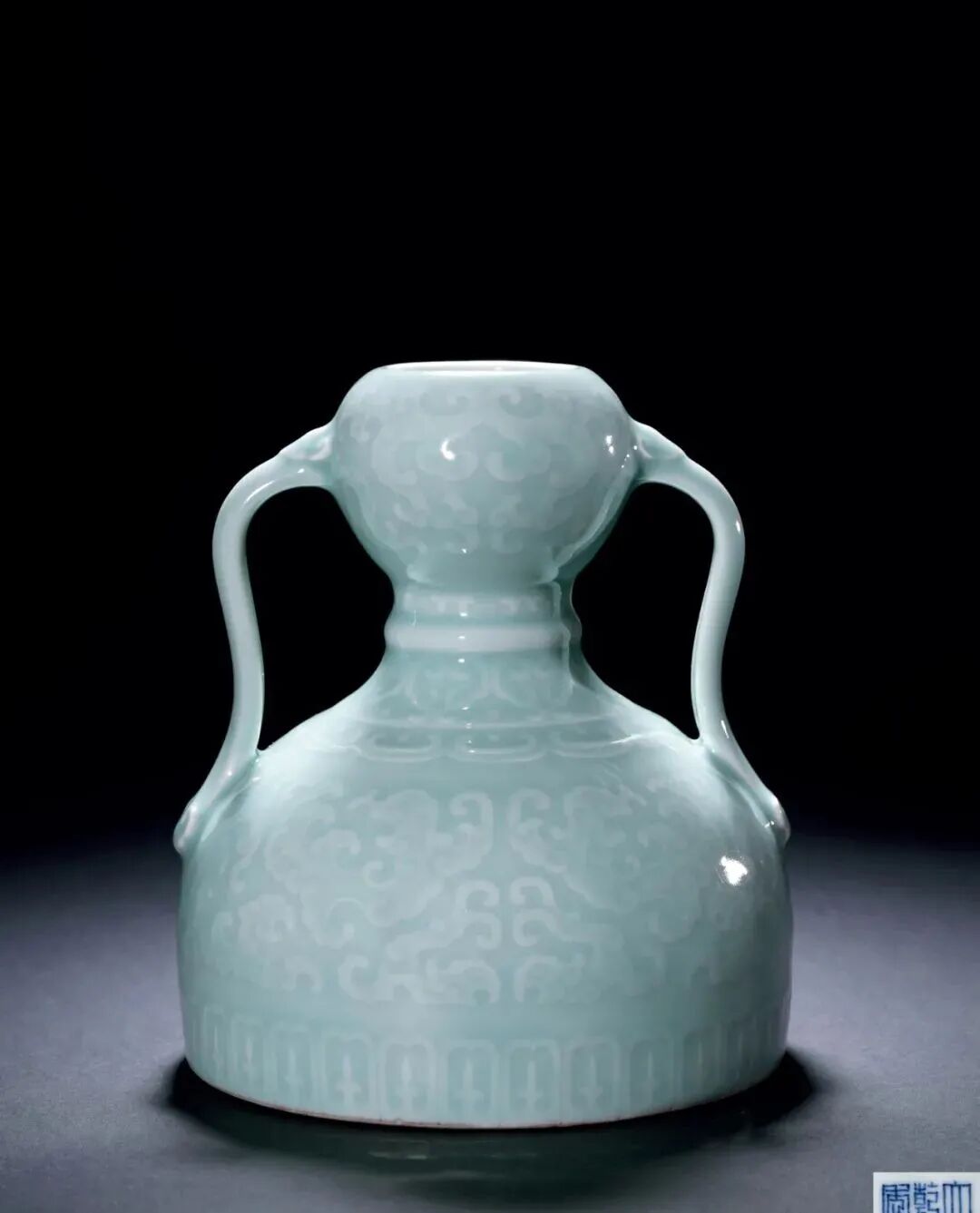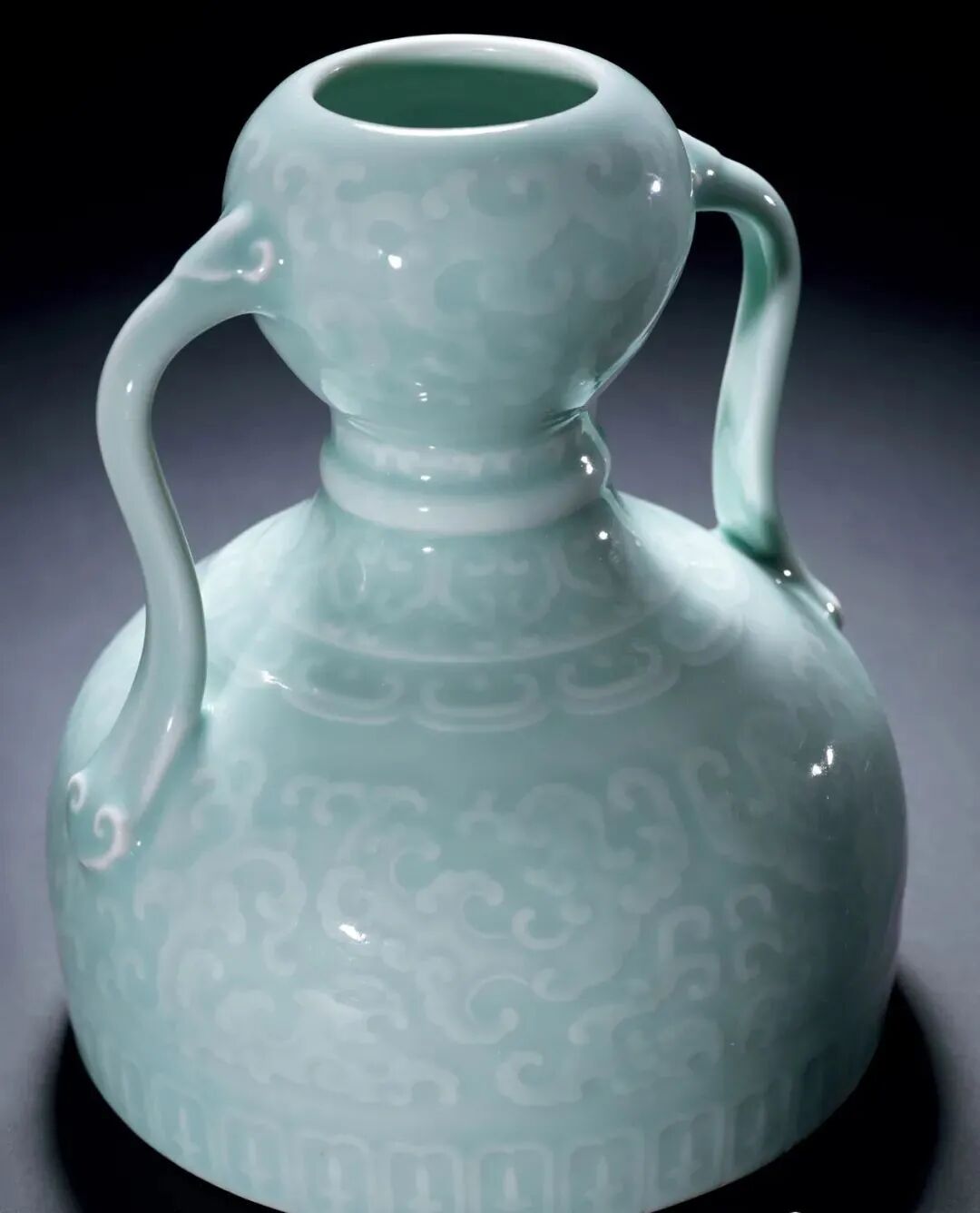 清乾隆 粉青釉浅浮雕夔龙纹绶带耳葫芦尊