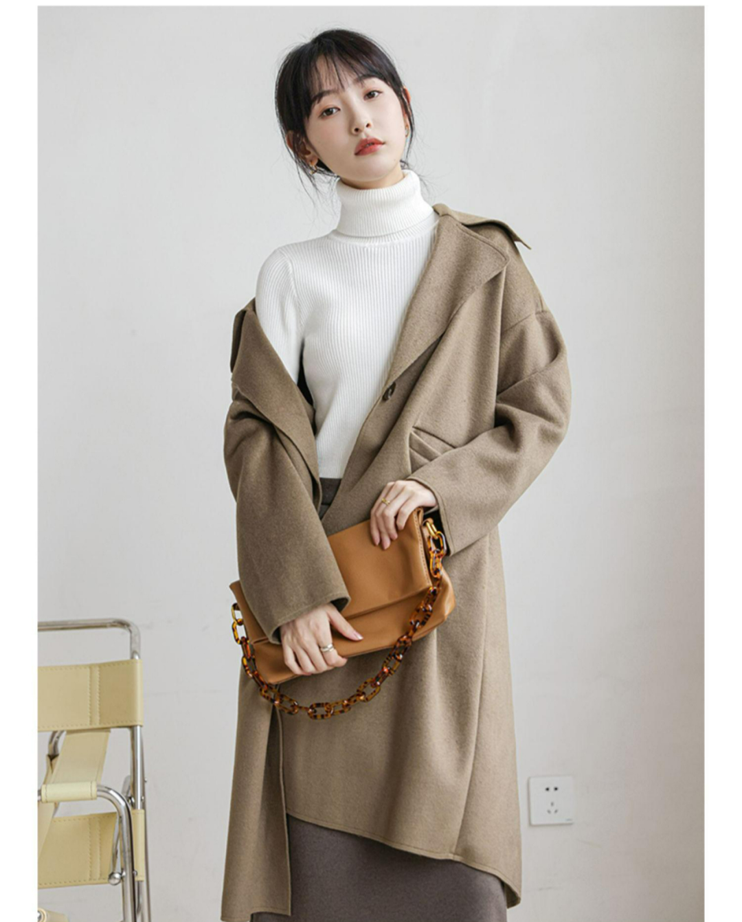 驼色大衣搭配棕色高领针织打底,中间用一件白衬衫过渡,整体和谐而有层次感。