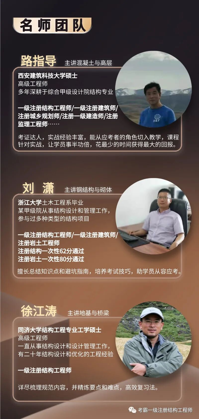一流的讲师团队三名讲师都是优秀的考证达人+资深一线结构工程师,备考能力与实践经验双一流