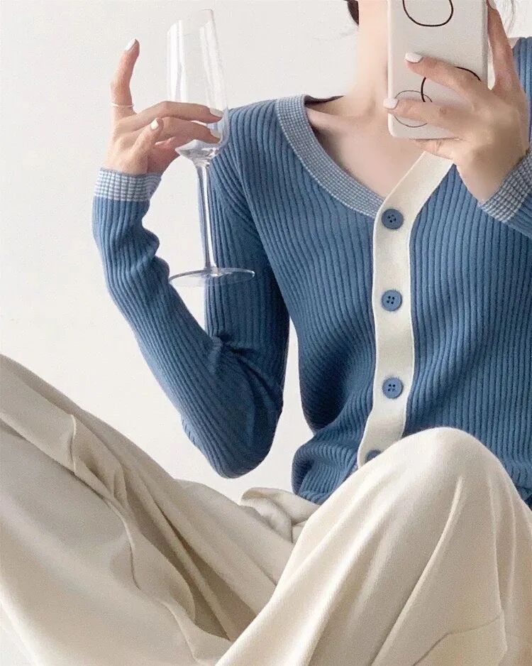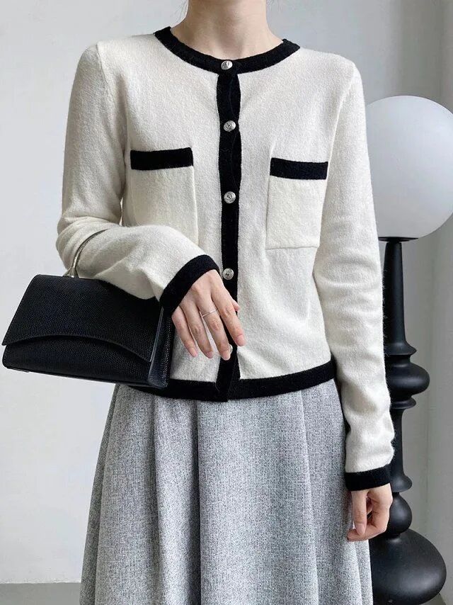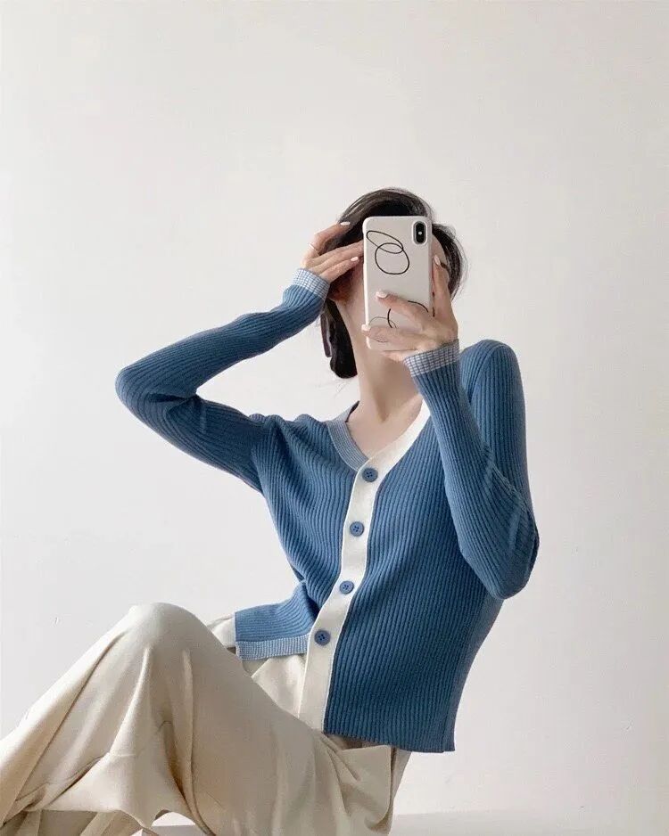 蓝白撞色更有个性,显得安静如水,黑白撞色的就百搭大方,门襟袖口的撞色和虚实嵌花也让这件针织衫很与众不同。