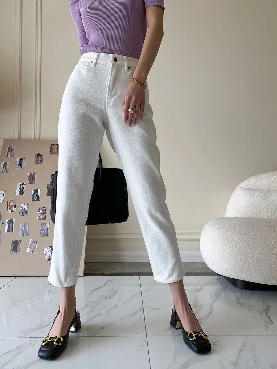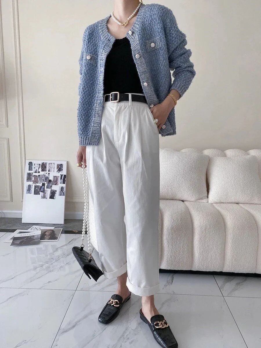 这身搭配白色九分裤就很绝,细管的长裤和上衣的蓬松感达成了平衡,不抢上身的主体,还衬得人利落得体。