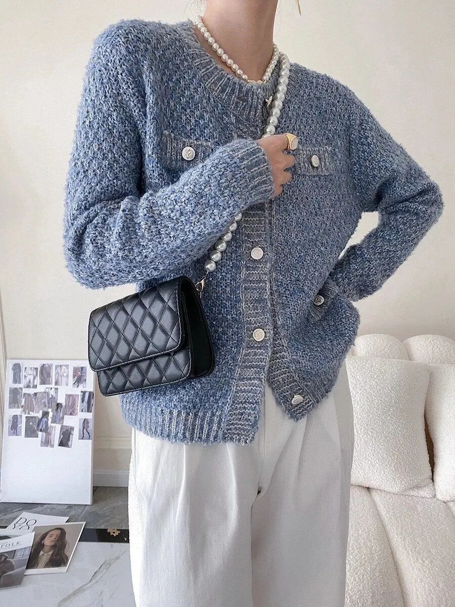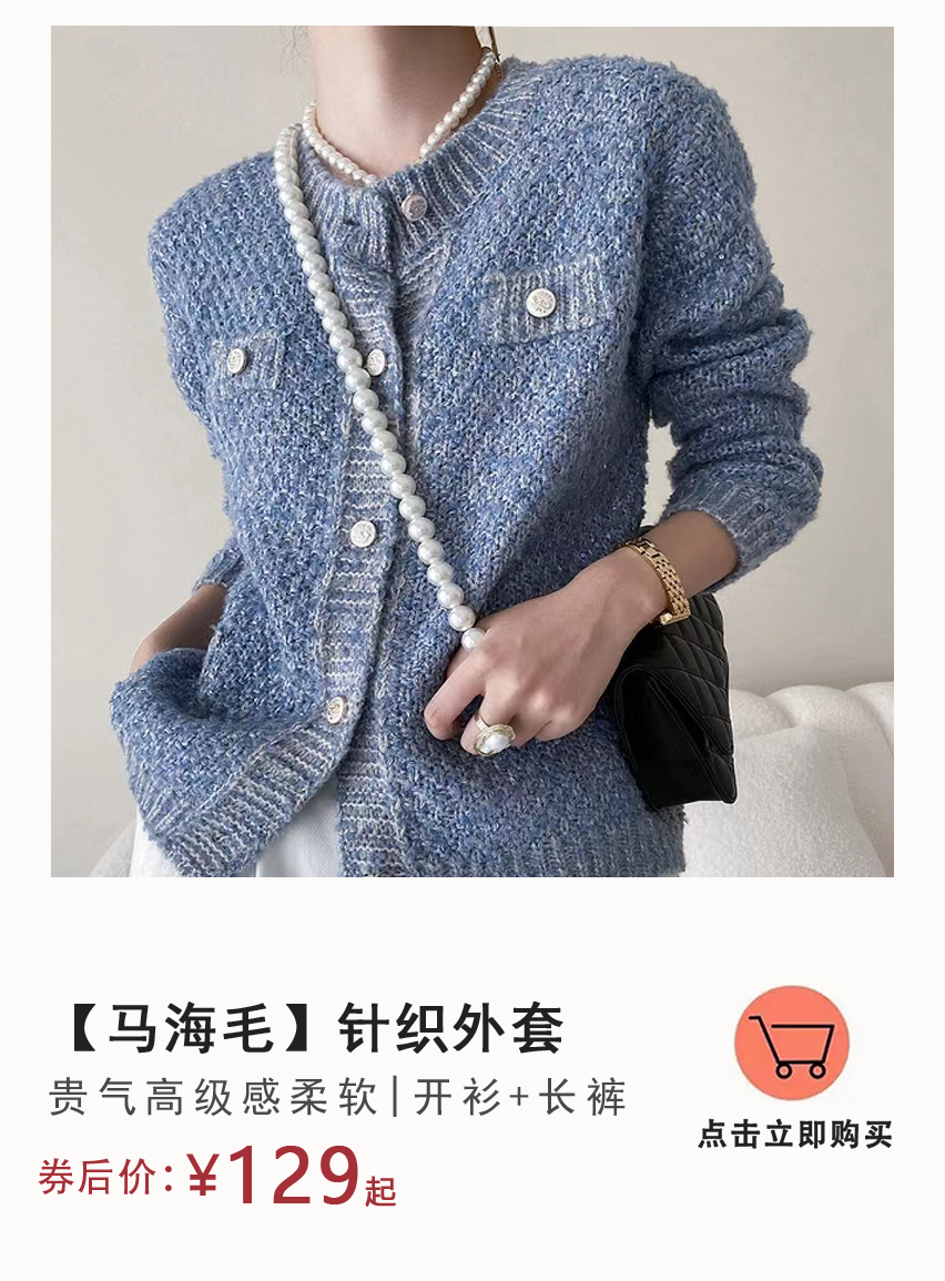 马海毛的粗针编织是看一次爱一次的款,这件蓝灰相间的莫兰迪色系中还加入了亮丝线,blingbling的就像星光洒在海面上,梦幻又显贵气。